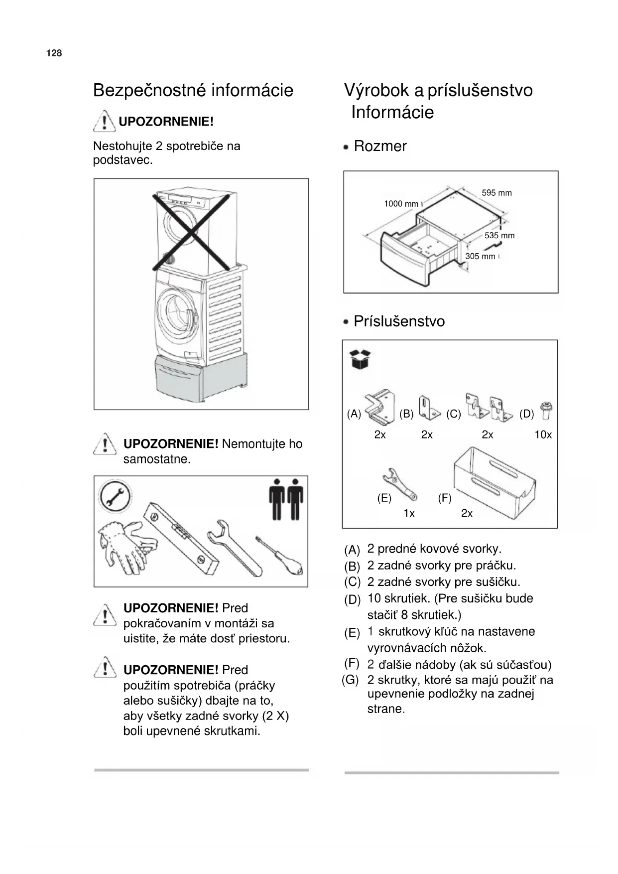(A) (B) (C) (D) (E) (F) (G) 2 predné kovové svorky. 2 zadné svorky pre práčku. 2 zadné svorky pre sušičku. 10 skrutiek. (Pre sušičku bude stačiť 8 skrutiek.) skrutkový kľúč na nastavene vyrovnávacích nôžok. ďalšie nádoby (ak sú súčasťou) 2 skrutky, ktoré sa majú použiť na upevnenie podložky na zadnej strane. 1000 mm 595 mm 535 mm 305 mm129