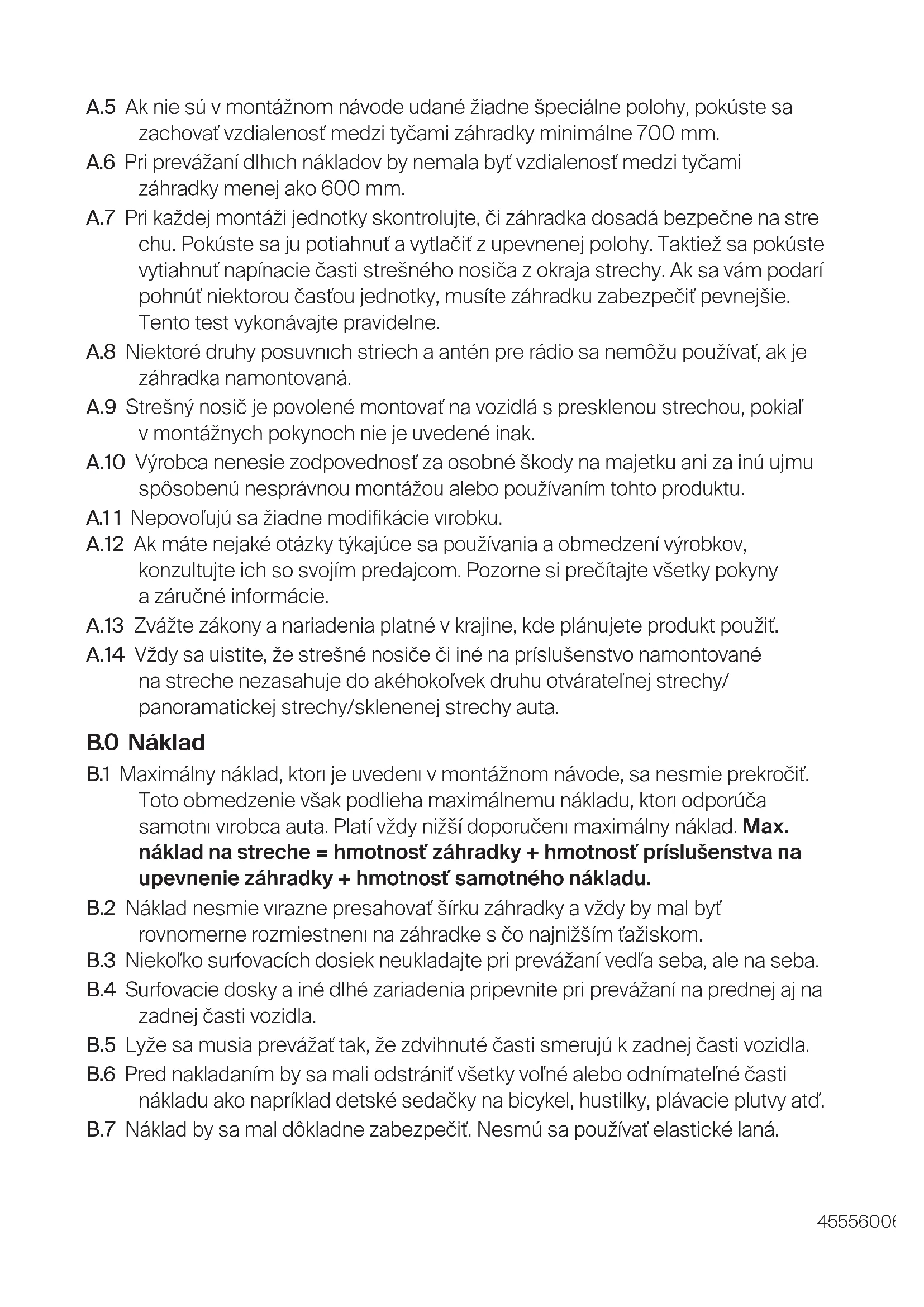 Dôležité – Dôsledne si prečítajte tieto pokyny auchovajte ich na budúce použitie. VAROVANIE Nedodržanie pokynov môže viesť k nesprávnemu používaniu výrobku, čo môže spôsobiť poškodenie alebo zranenie. A.0 Montáž A.1 Pomocou montážneho návodu si overte, či máte všetky potrebné súčiastky. A.2 Neinštalujte strešné nosiče Thule na žiadnu časť vozidla, ktorá bola akýmkoľvek spôsobom upravená. A.3 Vyčistite strechu auta a tie časti vırobku, ktoré s ňou prídu do kontaktu. A.4 Prečítajte si a pozorne dodržiavajte montážny návod a zoznam doporučení, ak bol priloženı. Potom primontujte tie časti, ktoré nie sú primontované, a to v správnom poradí, čiže 1, 2, 3 atď.455560060001 A.5 Ak nie sú v montážnom návode udané žiadne špeciálne polohy, pokúste sa zachovať vzdialenosť medzi tyčami záhradky minimálne 700 mm. A.6 Pri prevážaní dlhıch nákladov by nemala byť vzdialenosť medzi tyčami záhradky menej ako 600 mm. A.7 Pri každej montáži jednotky skontrolujte, či záhradka dosadá bezpečne na stre chu. Pokúste sa ju potiahnuť a vytlačiť z upevnenej polohy. Taktiež sa pokúste vytiahnuť napínacie časti strešného nosiča z okraja strechy. Ak sa vám podarí pohnúť niektorou časťou jednotky, musíte záhradku zabezpečiť pevnejšie. Tento test vykonávajte pravidelne. A.8 Niektoré druhy posuvnıch striech a antén pre rádio sa nemôžu používať, ak je záhradka namontovaná. A.9 Strešný nosič je povolené montovať na vozidlá spresklenou strechou, pokiaľ vmontážnych pokynoch nie je uvedené inak. A.10 Výrobca nenesie zodpovednosť za osobné škody na majetku ani za inú ujmu spôsobenú nesprávnou montážou alebo používaním tohto produktu. A.1 1 Nepovoľujú sa žiadne modifikácie vırobku. A.12 Ak máte nejaké otázky týkajúce sa používania aobmedzení výrobkov, konzultujte ich so svojím predajcom. Pozorne si prečítajte všetky pokyny azáručné informácie. A.13 Zvážte zákony anariadenia platné vkrajine, kde plánujete produkt použiť. A.14 Vždy sa uistite, že strešné nosiče či iné na príslušenstvo namontované na streche nezasahuje do akéhokoľvek druhu otvárateľnej strechy/ panoramatickej strechy/sklenenej strechy auta. B.0 Náklad B.1 Maximálny náklad, ktorı je uvedenı v montážnom návode, sa nesmie prekročiť. Toto obmedzenie však podlieha maximálnemu nákladu, ktorı odporúča samotnı vırobca auta. Platí vždy nižší doporučenı maximálny náklad. Max. náklad na streche = hmotnosť záhradky + hmotnosť príslušenstva na upevnenie záhradky + hmotnosť samotného nákladu. B.2 Náklad nesmie vırazne presahovať šírku záhradky a vždy by mal byť rovnomerne rozmiestnenı na záhradke s čo najnižším ťažiskom. B.3 Niekoľko surfovacích dosiek neukladajte pri prevážaní vedľa seba, ale naseba. B.4 Surfovacie dosky a iné dlhé zariadenia pripevnite pri prevážaní na prednej aj na zadnej časti vozidla. B.5 Lyže sa musia prevážať tak, že zdvihnuté časti smerujú k zadnej časti vozidla. B.6 Pred nakladaním by sa mali odstrániť všetky voľné alebo odnímateľné časti nákladu ako napríklad detské sedačky na bicykel, hustilky, plávacie plutvy atď. B.7 Náklad by sa mal dôkladne zabezpečiť. Nesmú sa používať elastické laná.46 5560060001 B.8 Po prejdení krátkej vzdialenosti a potom vo vhodnıch intervaloch by sa zabezpečenie nákladu malo skontrolovať. Pevnejšie prichyťte zabezpečenie nákladu kedykoľvek je to nevyhnutné. POZNÁMKA! Vždy skontrolujte zabezpečenie pripevnenia nákladu. C.0 Vlastnosti jazdy a obmedzenia pri riadení vozidla C.1 Rýchlosť vozidla sa musí prispôsobiť prevážanému nákladu a aktuálnym cestným podmienkam, napr. typu a kvalite cesty, poveternostným podmienkam, intenzite cestnej premávky a platným rýchlostným obmedzeniam, no nesmie za žiadnych okolností prekročiť hodnotu 130km/h. Vždy musia byť dodržané platné rýchlostné obmedzenia a iné nariadenia týkajúce sa cestnej premávky. C.2 Jazdite pomaly cez spomaľovače, s maximálnou rýchlosťou 10 km/h. C.3 Nezabudnite, že sa pri prevážaní vztıčenıch nákladov zväčší celková vıška voz idla. C.4 Pri prevážaní nákladu na streche vozidla sa zmenia jeho cestovné charakteristiky a správanie sa pri brzdení a zvıši sa jeho citlivosť na bočnı vietor. C.5 Vırobky, ktoré sa namontovali so zámkom, by mali byť počas prepravy vždy uzamknuté. C.6 Prispôsobte rýchlosť podmienkam na ceste a nákladu, ktorý prevážate, a často kontrolujte upevnenie nosiča, hlavne, keď jazdíte po nerovných cestách. D.0 Údržba D.1 Skontrolujte alebo vymeňte opotrebované alebo poškodené časti. D.2 Záhradka musí byť vždy čistená a udržiavaná, najmä v zime. D.3 Ak sa vırobok nepoužíva, mal by sa z vozidla odstrániť. D.4 Po odstránení vırobku z vozidla bezpečne uskladnite všetky voľné časti.