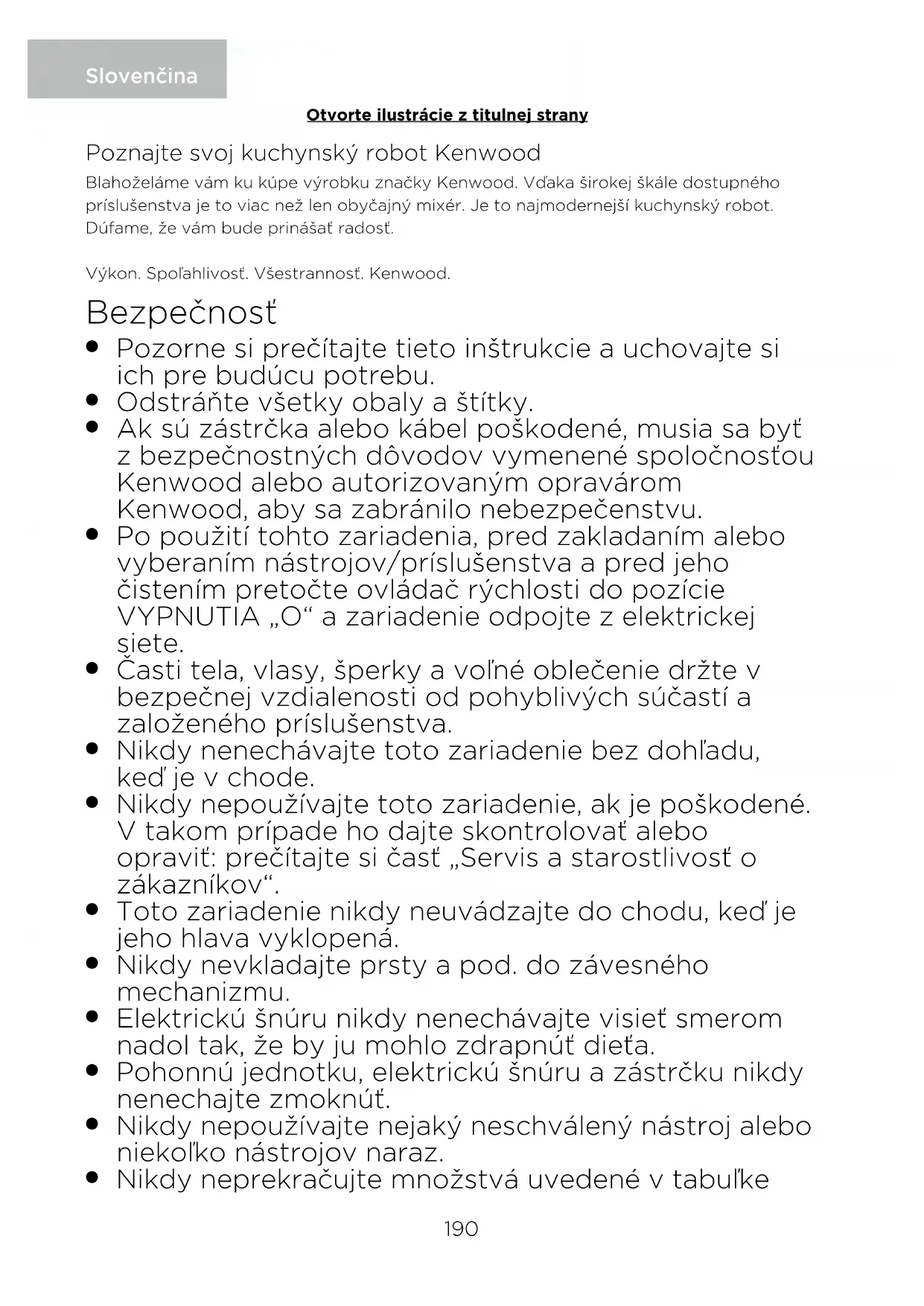 Toto zariadenie používajte len v domácnosti na stanovený účel. Firma Kenwood nepreberie žiadnu zodpovednosť za následky nesprávneho používania zariadenia, ani za následky nerešpektovania týchto inštrukcií. Pred zapnutím zariadenia Overte si, či vaša elektrická sieť má také isté parametre, aké sú uvedené na spodnej strane zariadenia. Toto zariadenie spĺňa požiadavky nariadenia Európskeho parlamentu a Rady (ES) č. 1935/2004 o materiáloch a predmetoch určených na styk s potravinami. Pred prvým použitím