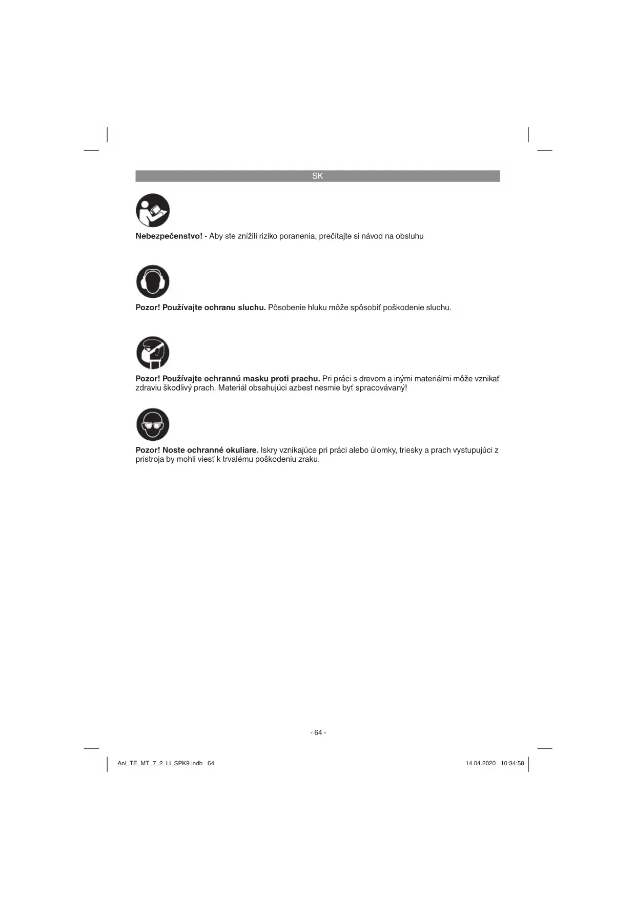 Nebezpečenstvo! - Aby ste znížili riziko poranenia, prečítajte si návod na obsluhu Pozor! Používajte ochranu sluchu. Pôsobenie hluku môže spôsobiť poškodenie sluchu. Pozor! Noste ochranné okuliare. Iskry vznikajúce pri práci alebo úlomky, triesky a prach vystupujúci z prístroja by mohli viesť k trvalému poškodeniu zraku. Pozor! Používajte ochrannú masku proti prachu. Pri práci s drevom a inými materiálmi môže vznikať zdraviu škodlivý prach. Materiál obsahujúci azbest nesmie byť spracovávaný! Anl_TE_MT_7_2_Li_SPK9.indb 64Anl_TE_MT_7_2_Li_SPK9.indb 64 14.04.2020 10:34:5814.04.2020 10:34:58SK