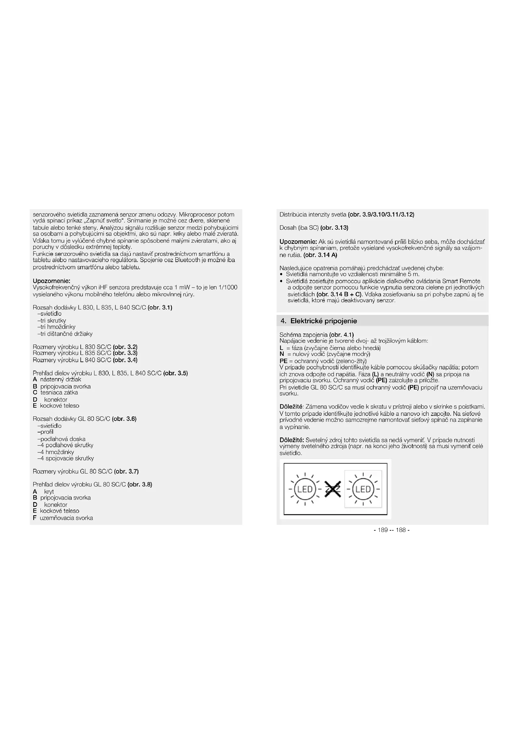 !- 189 -- 188 - senzorového svietidla zaznamená senzor zmenu odozvy. Mikroprocesor potom vydá spínací príkaz „Zapnúť svetlo“. Snímanie je možné cez dvere, sklenené tabule alebo tenké steny. Analýzou signálu rozlišuje senzor medzi pohybujúcimi sa osobami a pohybujúcimi sa objektmi, ako sú napr. kríky alebo malé zvieratá. Vďaka tomu je vylúčené chybné spínanie spôsobené malými zvieratami, ako aj poruchy v dôsledku extrémnej teploty. Funkcie senzorového svietidla sa dajú nastaviť prostredníctvom smartfónu a tabletu alebo nastavovacieho regulátora. Spojenie cez Bluetooth je možné iba prostredníctvom smartfónu alebo tabletu. Upozornenie: Vysokofrekvenčný výkon iHF senzora predstavuje cca 1 mW – to je len 1/1000 vysielaného výkonu mobilného telefónu alebo mikrovlnnej rúry. Rozsah dodávky L830, L835, L840SC/C (obr.3.1) – svietidlo – tri skrutky – tri hmoždinky – tri dištančné držiaky Rozmery výrobku L 830SC/C(obr.3.2) Rozmery výrobku L 835SC/C(obr.3.3) Rozmery výrobku L 840SC/C(obr.3.4) Prehľad dielov výrobku L830, L835, L840SC/C (obr.3.5) A nástenný držiak B pripojovacia svorka C tesniaca zátka D konektor E kockové teleso Rozsah dodávky GL 80SC/C(obr.3.6) – svietidlo – profil – podlahová doska – 4 podlahové skrutky – 4 hmoždinky – 4 spojovacie skrutky Rozmery výrobku GL 80SC/C(obr.3.7) Prehľad dielov výrobku GL 80SC/C(obr.3.8) A kryt B pripojovacia svorka D konektor E kockové teleso F uzemňovacia svorka Distribúcia intenzity svetla (obr.3.9/3.10/3.11/3.12) Dosah (iba SC) (obr.3.13) Upozornenie: Ak sú svietidlá namontované príliš blízko seba, môže dochádzať kchybným spínaniam, pretože vysielané vysokofrekvenčné signály sa vzájom- ne rušia. (obr.3.14A) Nasledujúce opatrenia pomáhajú predchádzať uvedenej chybe:
