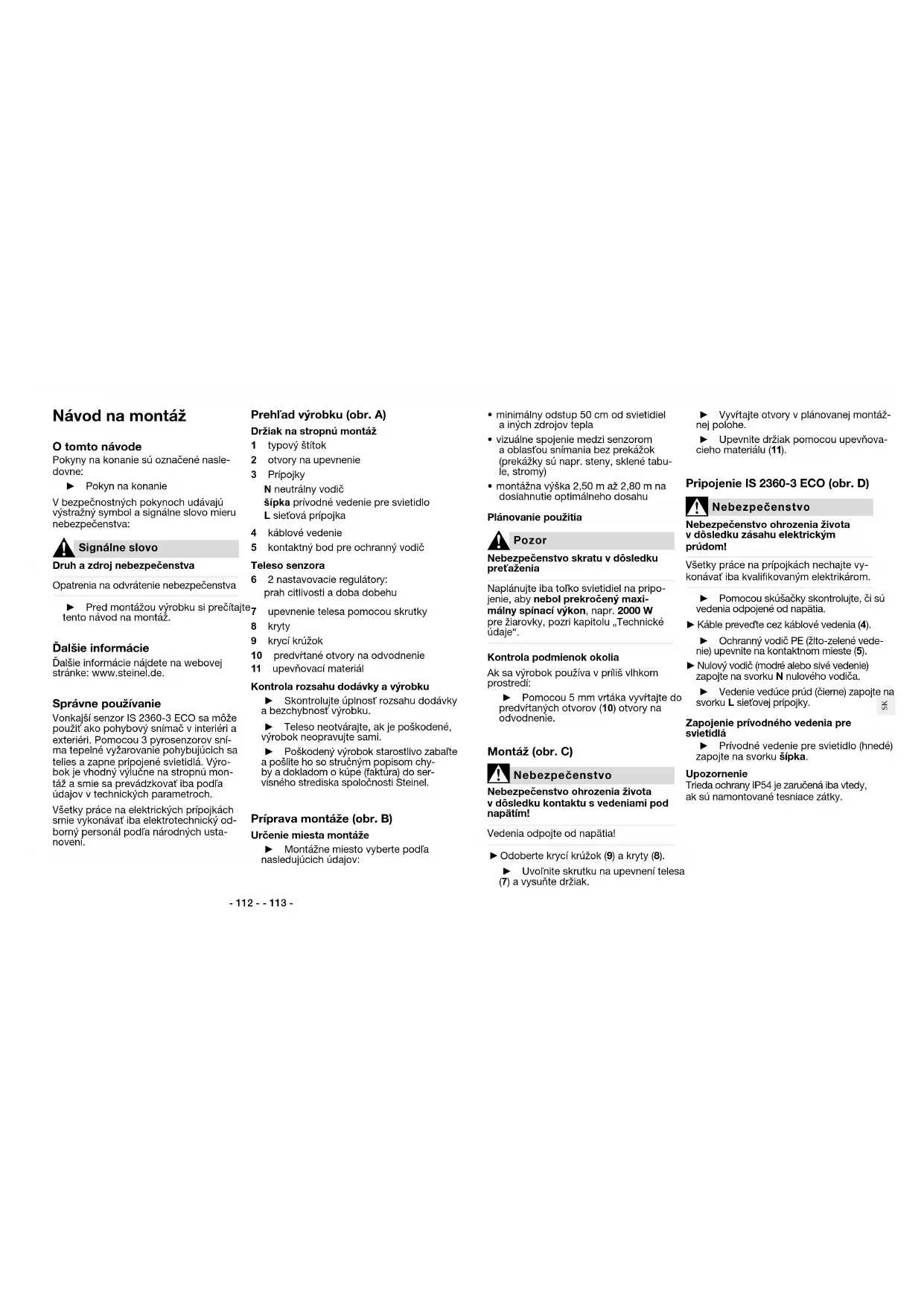 Signálne slovo Druh a zdroj nebezpečenstva Opatrenia na odvrátenie nebezpečenstva ► Pred montážou výrobku si prečítajte tento návod na montáž. Ďalšie informácie Ďalšie informácie nájdete na webovej stránke: www.steinel.de. Správne používanie Vonkajší senzor IS 2360-3 ECO sa môže použiť ako pohybový snímač v interiéri a exteriéri. Pomocou 3 pyrosenzorov sní- ma tepelné vyžarovanie pohybujúcich sa telies a zapne pripojené svietidlá. Výro- bok je vhodný výlučne na stropnú mon- táž a smie sa prevádzkovať iba podľa údajov v technických parametroch. Všetky práce na elektrických prípojkách smie vykonávať iba elektrotechnický od- borný personál podľa národných usta- novení. Prehľad výrobku (obr. A) Držiak na stropnú montáž 1 typový štítok 2 otvory na upevnenie 3 Prípojky N neutrálny vodič šípka prívodné vedenie pre svietidlo Lsieťová prípojka 4 káblové vedenie 5 kontaktný bod pre ochranný vodič Teleso senzora 6 2 nastavovacie regulátory: prah citlivosti a doba dobehu 7 upevnenie telesa pomocou skrutky 8 kryty 9 krycí krúžok 10 predvŕtané otvory na odvodnenie 11 upevňovací materiál Kontrola rozsahu dodávky a výrobku ► Skontrolujte úplnosť rozsahu dodávky a bezchybnosť výrobku. ► Teleso neotvárajte, ak je poškodené, výrobok neopravujte sami. ► Poškodený výrobok starostlivo zabaľte a pošlite ho so stručným popisom chy- by a dokladom o kúpe (faktúra) do ser- visného strediska spoločnosti Steinel. Príprava montáže (obr. B) Určenie miesta montáže ► Montážne miesto vyberte podľa nasledujúcich údajov:- 114 - - 115 -
