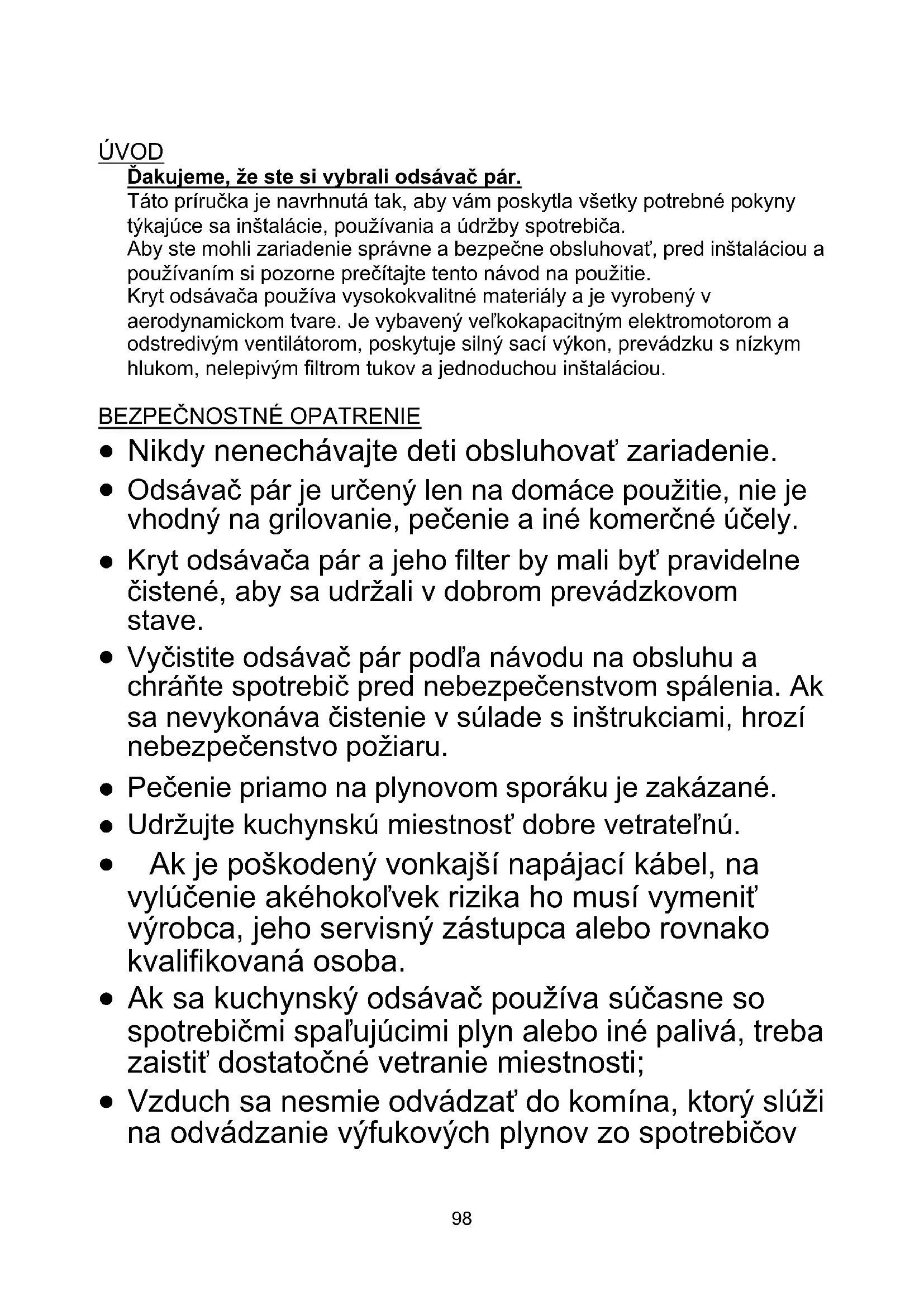 Udržujte kuchynskú miestnosť dobre vetrateľnú. Ak je poškodený vonkajší napájací kábel, na vylúčenie akéhokoľvek rizika ho musí vymeniť výrobca, jeho servisný zástupca alebo rovnako kvalifikovaná osoba. Ak sa kuchynský odsávač používa súčasne so spotrebičmi spaľujúcimi plyn alebo iné palivá, treba zaistiť dostatočné vetranie miestnosti; Vzduch sa nesmie odvádzať do komína, ktorý slúži na odvádzanie výfukových plynov zo spotrebičov 98spaľujúcich plyn alebo iné palivá;