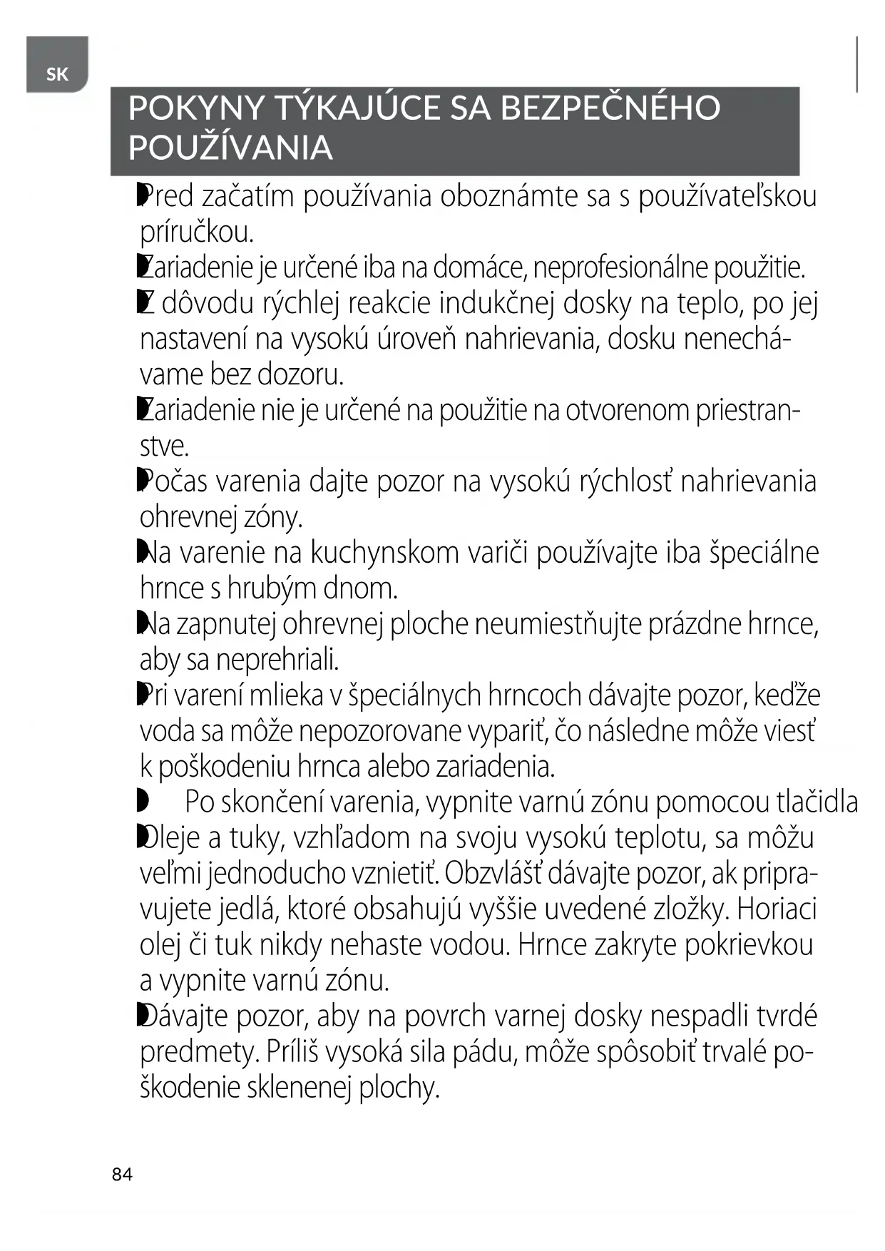 Zariadenie, kábel a zástrčku neponárajte do vody ani do iných kvapalín. Skontrolujte, či sa parametre uvedené na výrobnom štítku zariadenia zhodujú s parametrami používanej elektrickej siete. POZOR! Horúci povrch. Varná doska môže byť po skončení varenia horúca. Dávajte pozor, aby ste sa nepopálili.88