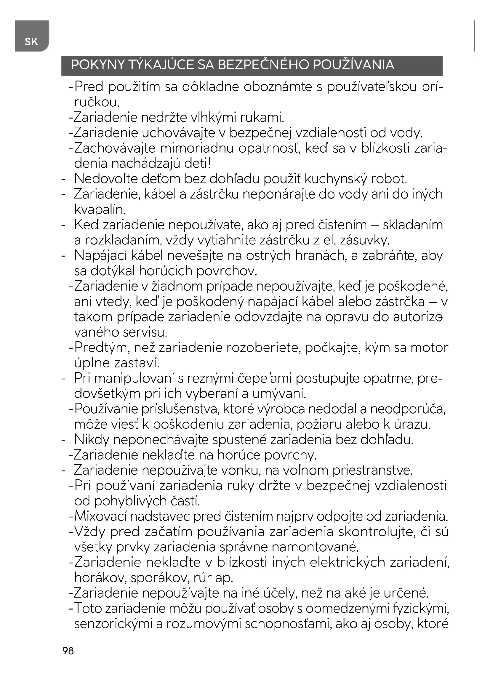 Zachovávajte mimoriadnu opatrnosť, keď sa v blízkosti zaria- denia nachádzajú deti! - Nedovoľte deťom bez dohľadu použiť kuchynský robot. - Zariadenie, kábel a zástrčku neponárajte do vody ani do iných kvapalín. - Keď zariadenie nepoužívate, ako aj pred čistením – skladaním a rozkladaním, vždy vytiahnite zástrčku z el. zásuvky. - Napájací kábel nevešajte na ostrých hranách, a zabráňte, aby sa dotýkal horúcich povrchov.