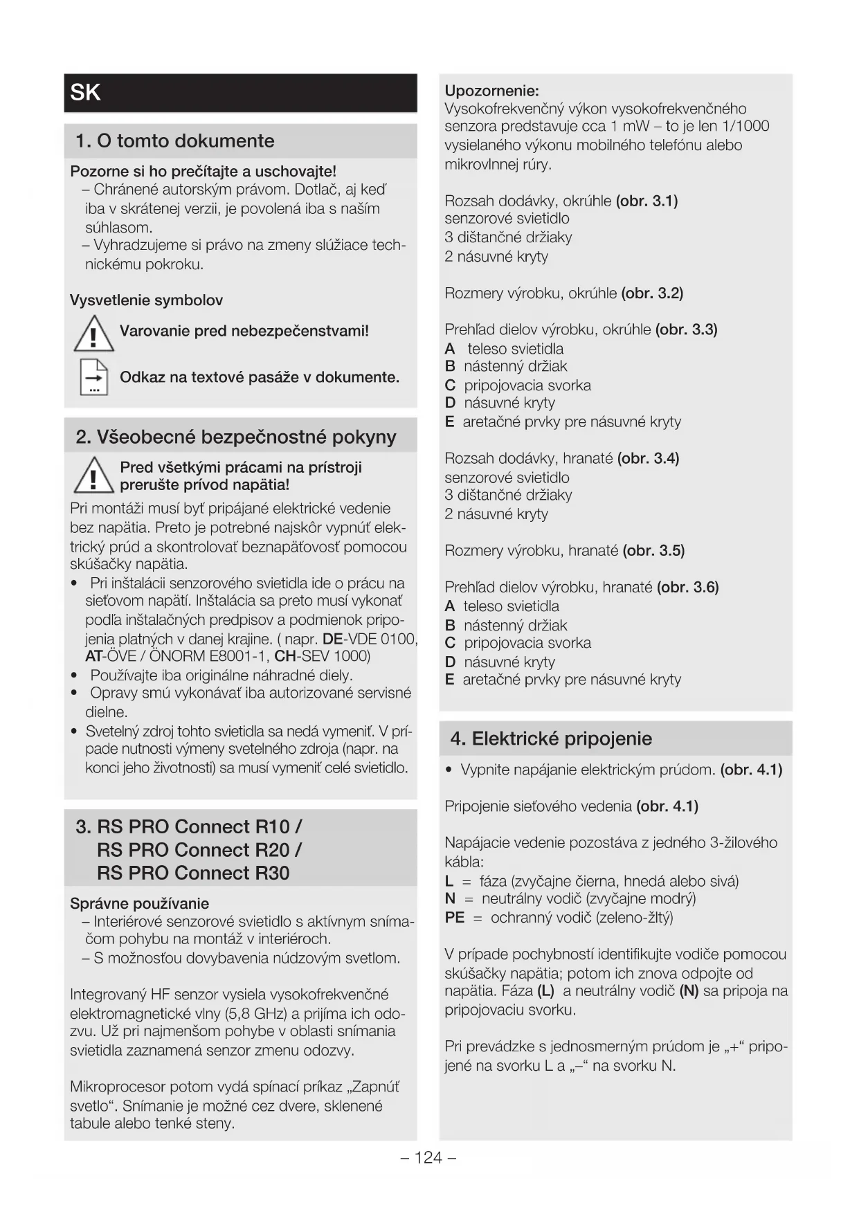 RS PRO Connect R20 / RS PRO Connect R30 Správne používanie – Interiérové senzorové svietidlo saktívnym sníma- čom pohybu na montáž vinteriéroch. – S možnosťou dovybavenia núdzovým svetlom. Integrovaný HF senzor vysiela vysokofrekvenčné elektromagnetické vlny (5,8GHz) a prijíma ich odo- zvu. Už pri najmenšom pohybe voblasti snímania svietidla zaznamená senzor zmenu odozvy. Mikroprocesor potom vydá spínací príkaz „Zapnúť svetlo“. Snímanie je možné cez dvere, sklenené tabule alebo tenké steny. Upozornenie: Vysokofrekvenčný výkon vysokofrekvenčného senzora predstavuje cca 1mW – to je len 1/1000 vysielaného výkonu mobilného telefónu alebo mikrovlnnej rúry. Rozsah dodávky, okrúhle (obr. 3.1) senzorové svietidlo 3 dištančné držiaky 2 násuvné kryty Rozmery výrobku, okrúhle (obr.3.2) Prehľad dielov výrobku, okrúhle (obr.3.3) A teleso svietidla B nástenný držiak C pripojovacia svorka D násuvné kryty E aretačné prvky pre násuvné kryty Rozsah dodávky, hranaté (obr.3.4) senzorové svietidlo 3 dištančné držiaky 2 násuvné kryty Rozmery výrobku, hranaté (obr.3.5) Prehľad dielov výrobku, hranaté (obr.3.6) A teleso svietidla B nástenný držiak C pripojovacia svorka D násuvné kryty E aretačné prvky pre násuvné kryty