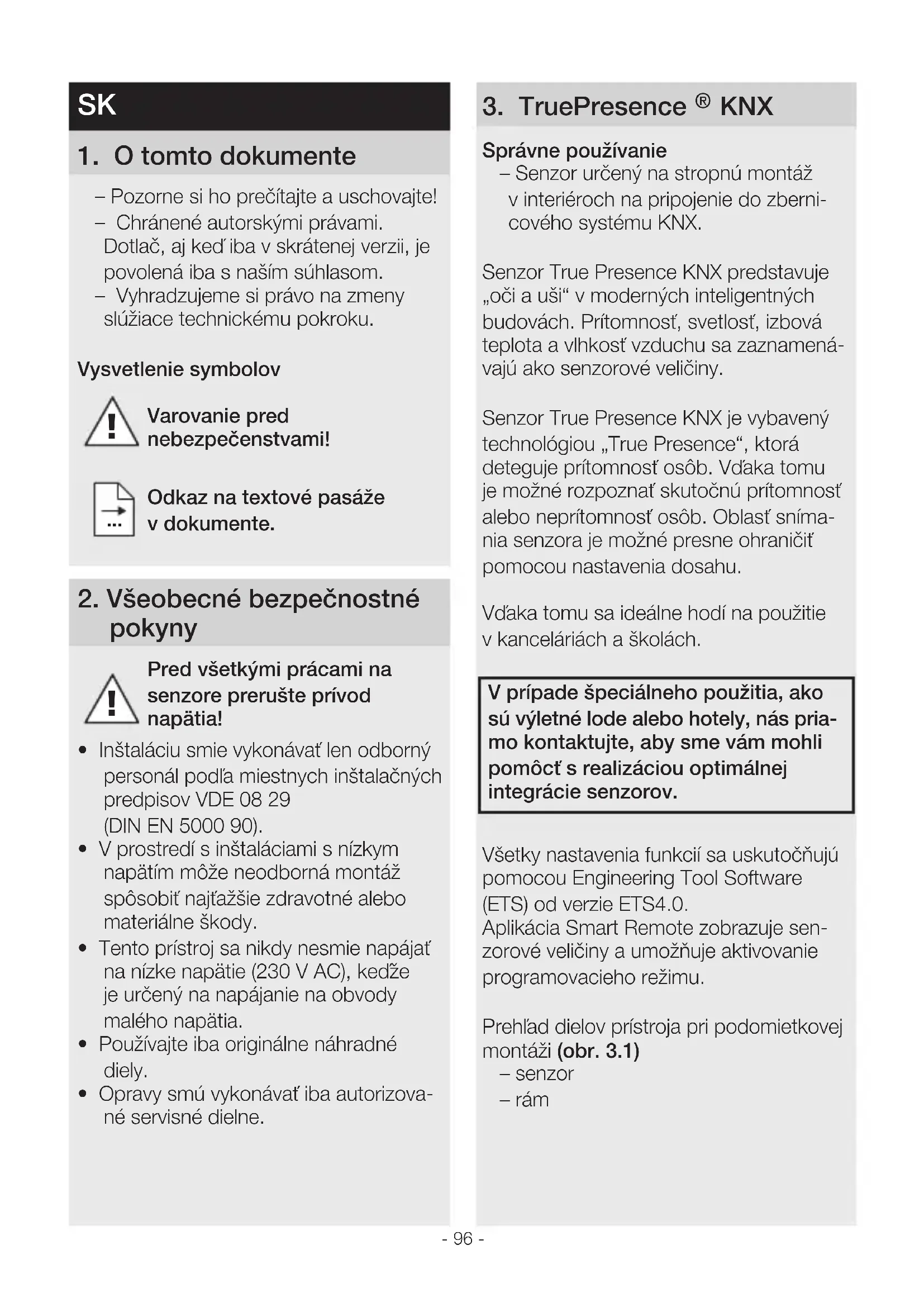ZÁRUKA ROK VÝROBCU ZÁRUKA ROKY VÝROBCU ZÁRUKA ROKOV VÝROBCU SK- 100 - Rozmery (Š×V×H v mm) pod omietkou: 103×103×32 na omietke: 119×119×33 Odber prúdu 30 mA Napájacie napätie zbernicové napätie KNX, 21 – 30 V Montážna výška 2 – 12 m Oblasť snímania 360° Dosah Ø 9 m True Presence (do max. montážnej výšky 4m) prítomnosť Ø 15 m pohyb Ø 15 m (možnosť nastaviť na centimeter presne) Senzorové hodnoty True Presence meranie svetla teplota: 0 – 40 °C relatívna vlhkosť vzduchu: 0 – 100% Výstupy 4× výstup svetla (ON/OFF, hodnota tlmenia, scéna) hodnota tlmenia sefektným svetlom 2× regulácia konštantného svetla so základným osvetlením, kúrenie/ventilácia/klíma, prítomnosť, teplota, relatívna vlhkosť vzduchu, rosný bod, logická mriežka, pohodlie, neprítomnosť Nastavenie času 30 sekúnd do 18:12:15 hod. (hh:mm:ss), režim IQ Nastavenie stmievania 2 – 1000 lx Teplotný rozsah 0 °C až +40 °C Krytie IP 20 Frekvencia True Presence 7,2 GHz (reaguje na mikropohyby vitálnych funkcií) Vysielací výkon UWB ≤ -41dBm/MHz Frekvencia Bluetooth 2,4 – 2,48 GHz Vysielací výkon Bluetooth 5 dBm/3 mW 12 Technické údaje- 100 - - 101 - 13 Prevádzkové poruchy