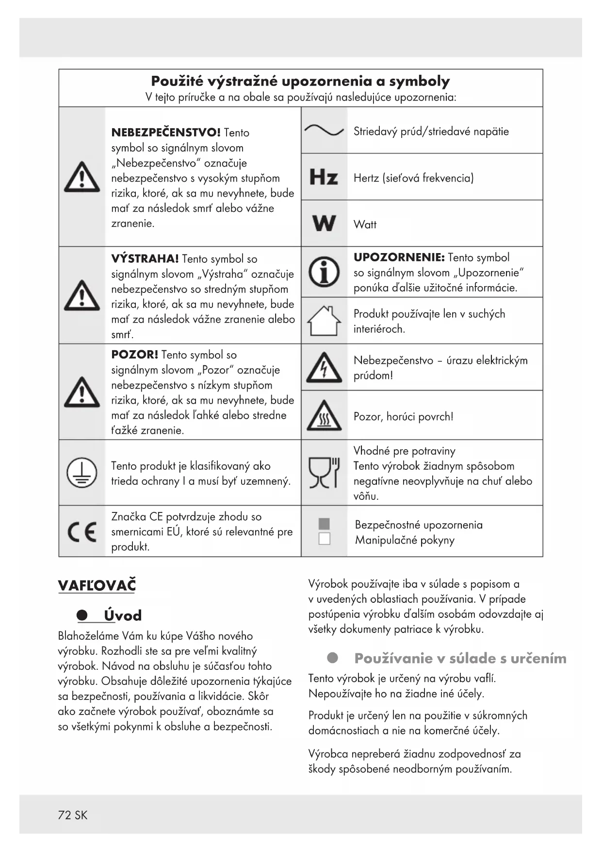VÝSTRAHA! Neodborné použitie môže spôsobiť zranenia. Tento produkt používajte výlučne podľa tohto návodu. Nepokúšajte sa produkt žiadnym spôsobom meniť. Tento produkt je určený na to, aby sa používal v domácnosti, prípadne na podobné používanie, ako napríklad: – V kuchyniach pre zamestnancov, v obchodoch, kanceláriách a iných komerčných oblastiach; – V poľnohospodárskych usadlostiach; – Zákazníkmi v hoteloch, moteloch a iných obytných zariadeniach; – V penziónoch s raňajkami. Elektrická bezpečnosť NEBEZPEČENSTVO! Ne- bezpečenstvo zásahu elektrickým prúdom! Ne‑ pokúšajte sa opravovať produkt svojpomocne. V prípade poru‑ chy môžu opravy vykonávať výlučne kvalifikovaní odborníci. POZOR! Horúci povrch! Produkt je počas prevádzky horúci. Produktu sa nedotýkajte počas používania alebo bezprostredne po ňom. Pri používaní sa vyžaduje opatrnosť, keďže rukoväť sa môže trochu zohriať.