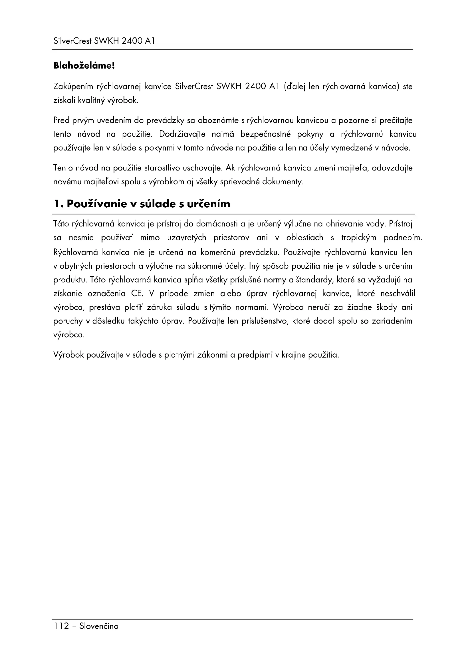 12. Záručné pokyny ........................................................................................127SilverCrest SWKH 2400 A1 112 – Slovenčina Blahoželáme! Zakúpením rýchlovarnej kanvice SilverCrest SWKH 2400 A1 (ďalej len rýchlovarná kanvica) ste získali kvalitný výrobok. Pred prvým uvedením do prevádzky sa oboznámte s rýchlovarnou kanvicou a pozorne si prečítajte tento návod na použitie. Dodržiavajte najmä bezpečnostné pokyny a rýchlovarnú kanvicu používajte len v súlade s pokynmi v tomto návode na použitie a len na účely vymedzené v návode. Tento návod na použitie starostlivo uschovajte. Ak rýchlovarná kanvica zmení majiteľa, odovzdajte novému majiteľovi spolu s výrobkom aj všetky sprievodné dokumenty.
