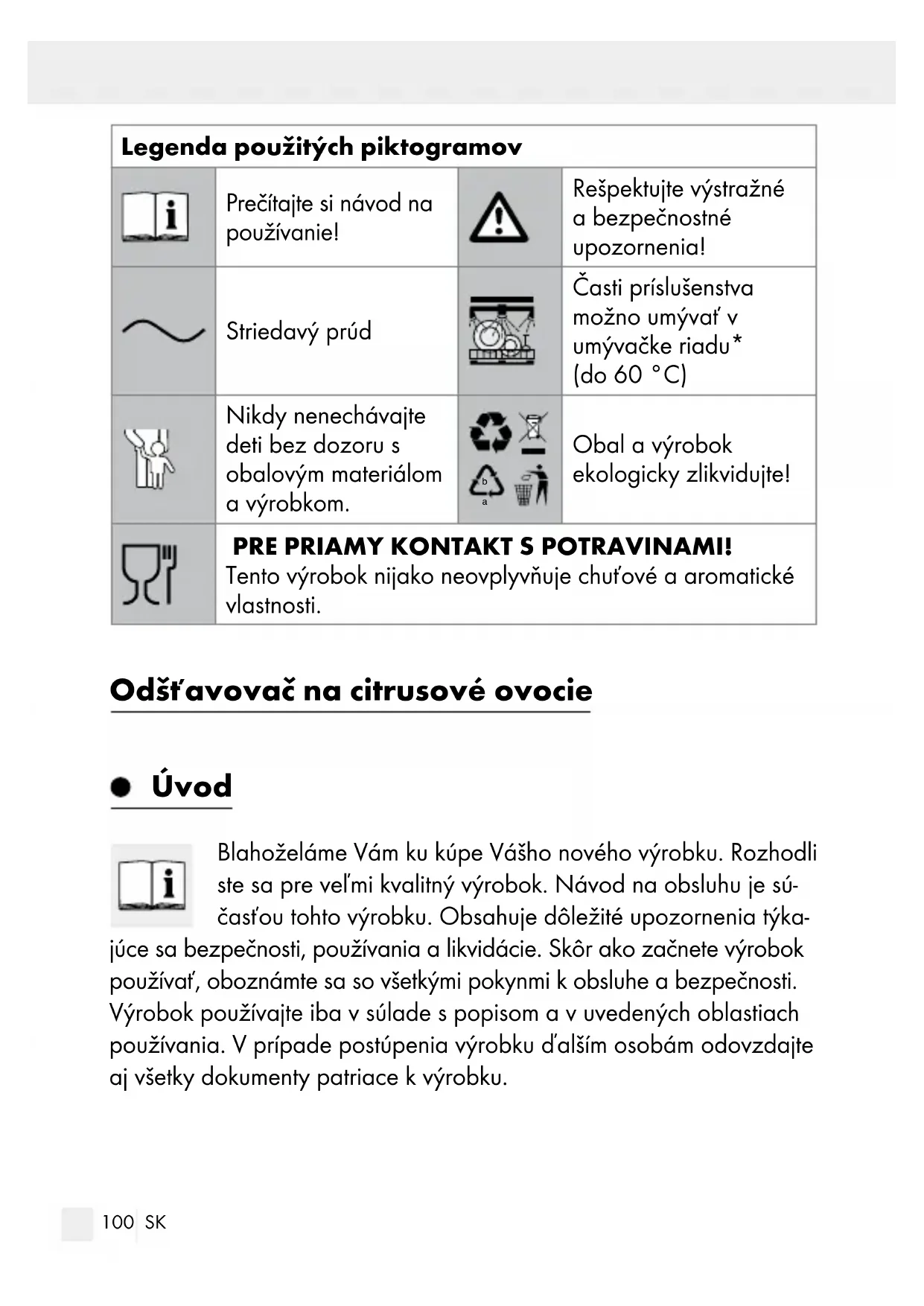 Obal a výrobok ekologicky zlikvidujte! PRE PRIAMY KONTAKT S POTRAVINAMI! Tento výrobok nijako neovplyvňuje chuťové a aromatické vlastnosti. Odšťavovač na citrusové ovocie Úvod Blahoželáme Vám ku kúpe Vášho nového výrobku. Rozhodli ste sa pre veľmi kvalitný výrobok. Návod na obsluhu je sú- časťou tohto výrobku. Obsahuje dôležité upozornenia týka- júce sa bezpečnosti, používania a likvidácie. Skôr ako začnete výrobok používať, oboznámte sa so všetkými pokynmi k obsluhe a bezpečnosti. Výrobok používajte iba v súlade s popisom a v uvedených oblastiach používania. V prípade postúpenia výrobku ďalším osobám odovzdajte aj všetky dokumenty patriace k výrobku.101 SK Používanie v súlade s určeným účelom Výrobok je určený výlučne na odšťavovanie citrusových plodov. Iné použitie ako je vyššie popísané alebo úpravy výrobku sú neprípustné a vedú k poškodeniam. Výrobca nezodpovedá za škody vzniknuté po- užívaním výrobku, ktoré je v rozpore s jeho určeným účelom. Výrobok nie je určený na komerčné používanie. Popis častí