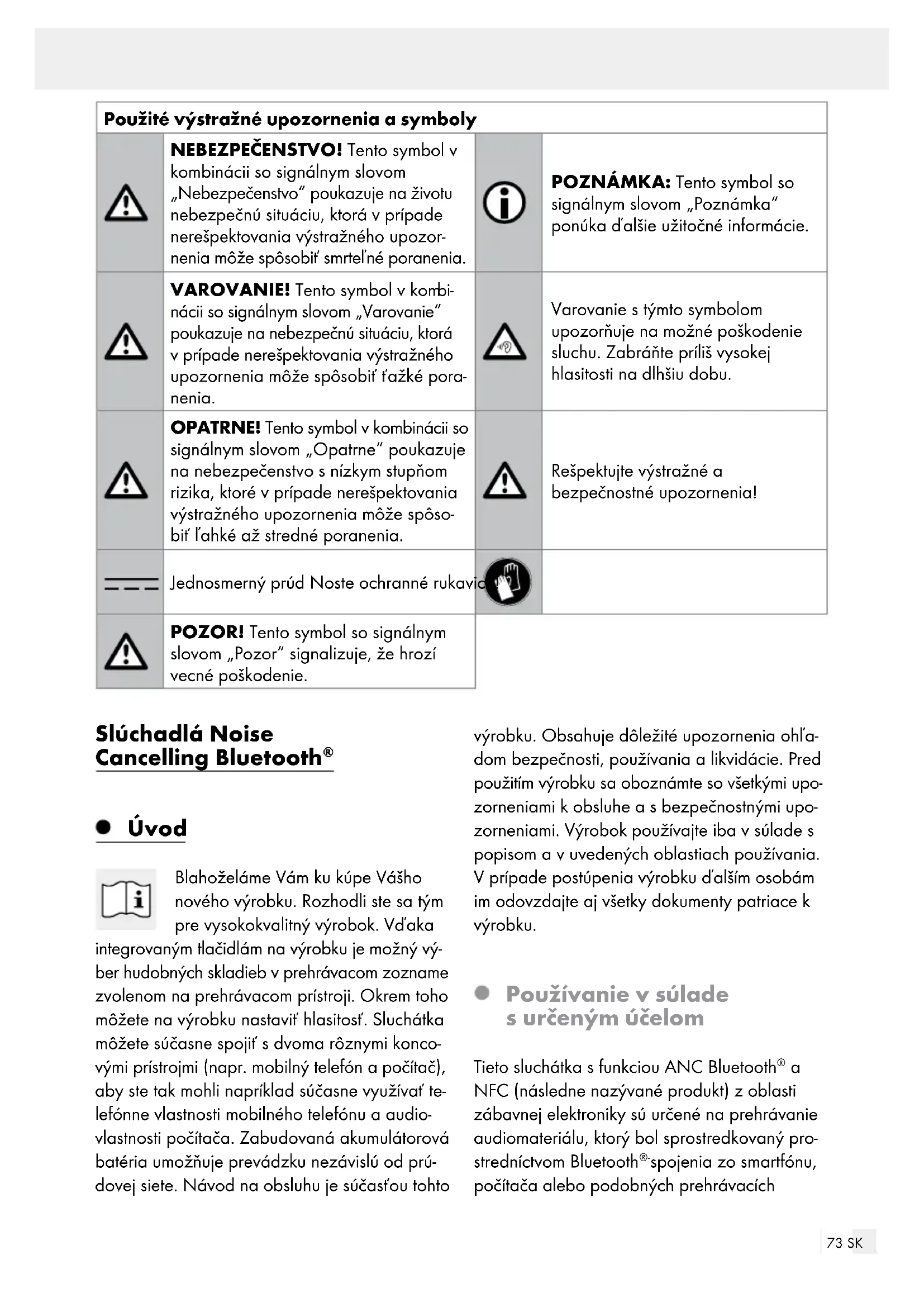Úvod Blahoželáme Vám ku kúpe Vášho nového výrobku. Rozhodli ste sa tým pre vysokokvalitný výrobok. Vďaka integrovaným tlačidlám na výrobku je možný vý- ber hudobných skladieb v prehrávacom zozname zvolenom na prehrávacom prístroji. Okrem toho môžete na výrobku nastaviť hlasitosť. Sluchátka môžete súčasne spojiť s dvoma rôznymi konco- vými prístrojmi (napr. mobilný telefón a počítač), aby ste tak mohli napríklad súčasne využívať te- lefónne vlastnosti mobilného telefónu a audio- vlastnosti počítača. Zabudovaná akumulátorová batéria umožňuje prevádzku nezávislú od prú- dovej siete. Návod na obsluhu je súčasťou tohto výrobku. Obsahuje dôležité upozornenia ohľa- dom bezpečnosti, používania a likvidácie. Pred použitím výrobku sa oboznámte so všetkými upo- zorneniami k obsluhe a s bezpečnostnými upo- zorneniami. Výrobok používajte iba v súlade s popisom a v uvedených oblastiach používania. V prípade postúpenia výrobku ďalším osobám im odovzdajte aj všetky dokumenty patriace k výrobku. Používanie v súlade s určeným účelom Tieto sluchátka s funkciou ANC Bluetooth