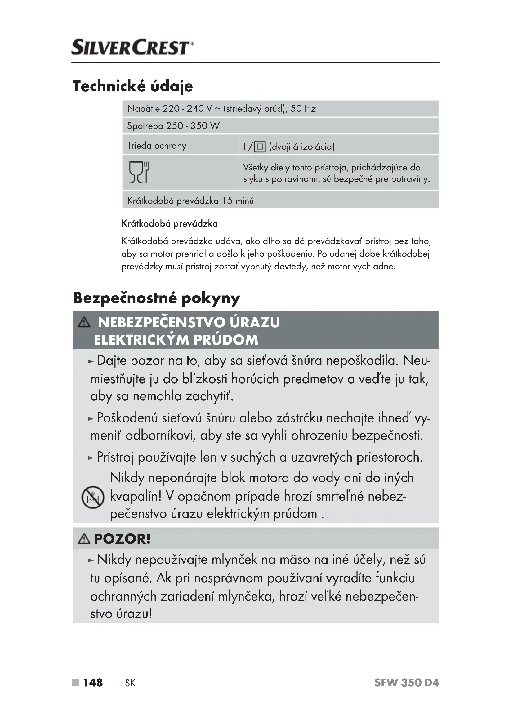 SK SFW 350 D4 Technické údaje Napätie 220 - 240 V ∼ (striedavý prúd), 50 Hz Spotreba 250 - 350 W Trieda ochrany II/ (dvojitá izolácia) Všetky diely tohto prístroja, prichádzajúce do styku s potravinami, sú bezpečné pre potraviny. Krátkodobá prevádzka 15 minút Krátkodobá prevádzka Krátkodobá prevádzka udáva, ako dlho sa dá prevádzkovať prístroj bez toho, aby sa motor prehrial a došlo k jeho poškodeniu. Po udanej dobe krátkodobej prevádzky musí prístroj zostať vypnutý dovtedy, než motor vychladne. Bezpečnostné pokyny