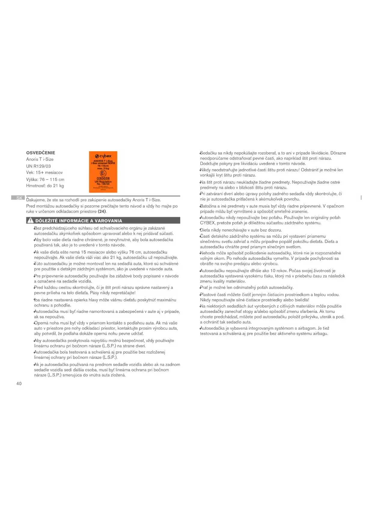 Toto je detský zádržný systém i-Size. Vyhovuje nariadeniu UN č. R129/03 pre použitie vo vozidlách kompatibilných s polohovacím systémom i-Size, ako je uvedené výrobcom vozidla v používateľskom návode pre vozidlo. Ak vaše vozidlo nemá polohovací systém i-Size, skontrolujte v priloženom zozname vozidiel, či je použitie autosedačky možné. Najnovšiu verziu zoznamu vozidiel môžete nájsť na www.cybex-online.com. Ak vaše vozidlo nemá systém ISOFIX, autosedačku nie je možné používať. Ak vo vozidle nie je dosť miesta, môžete systém lineárnej ochrany pri bočnom náraze (L.S.P.) zložiť. Nie je zaručené, že vo všetkých schválených vozidlách bude možné použiť všetky sediace a nastaviteľné polohy.
