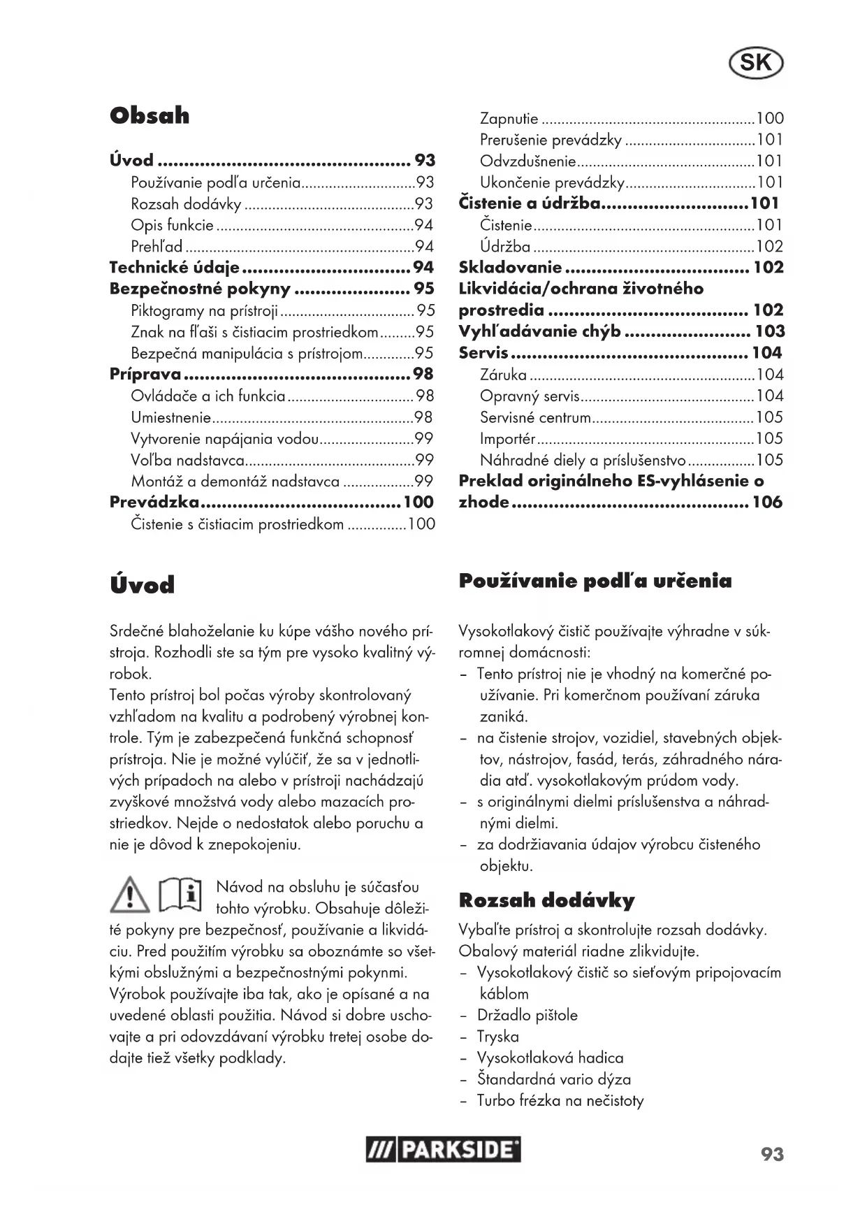 - Používanie podľa určenia Vysokotlakový čistič používajte výhradne v súk- romnej domácnosti: – Tento prístroj nie je vhodný na komerčné po- užívanie. Pri komerčnom používaní záruka zaniká. – na čistenie strojov, vozidiel, stavebných objek- tov, nástrojov, fasád, terás, záhradného nára- dia atď. vysokotlakovým prúdom vody. – s originálnymi dielmi príslušenstva a náhrad- nými dielmi. – za dodržiavania údajov výrobcu čisteného objektu. Rozsah dodávky Vybaľte prístroj a skontrolujte rozsah dodávky. Obalový materiál riadne zlikvidujte. – Vysokotlakový čistič so sieťovým pripojovacím káblom – Držadlo pištole – Tryska – Vysokotlaková hadica – Štandardná vario dýza – Turbo frézka na nečistoty Úvod Srdečné blahoželanie ku kúpe vášho nového prí- stroja. Rozhodli ste sa tým pre vysoko kvalitný vý- robok. Tento prístroj bol počas výroby skontrolovaný vzhľadom na kvalitu a podrobený výrobnej kon- trole. Tým je zabezpečená funkčná schopnosť prístroja. Nie je možné vylúčiť, že sa v jednotli- vých prípadoch na alebo v prístroji nachádzajú zvyškové množstvá vody alebo mazacích pro- striedkov. Nejde o nedostatok alebo poruchu a nie je dôvod k znepokojeniu. Návod na obsluhu je súčasťou tohto výrobku. Obsahuje dôleži- té pokyny pre bezpečnosť, používanie a likvidá- ciu. Pred použitím výrobku sa oboznámte so všet- kými obslužnými a bezpečnostnými pokynmi. Výrobok používajte iba tak, ako je opísané a na uvedené oblasti použitia. Návod si dobre uscho- vajte a pri odovzdávaní výrobku tretej osobe do- dajte tiež všetky podklady. Úvod 93 Používanie podľa určenia p. 93