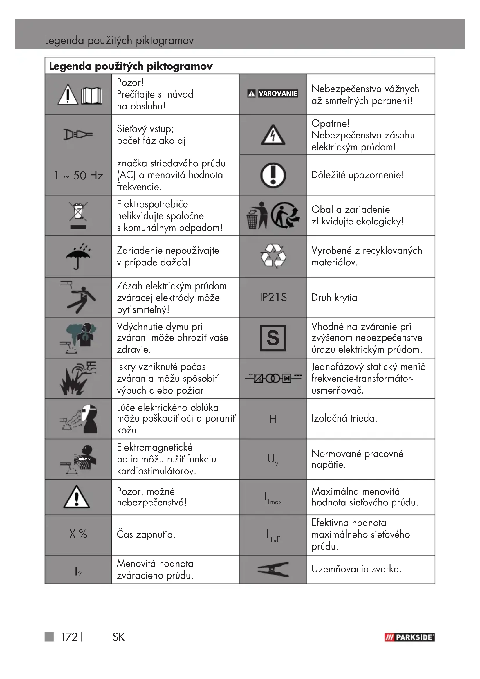Legenda použitých piktogramov Legenda použitých piktogramov Pozor! Prečítajte si návod naobsluhu! VAROVANIE Nebezpečenstvo vážnych až smrteľných poranení! Sieťový vstup; počet fáz ako aj Opatrne! Nebezpečenstvo zásahu elektrickým prúdom! 1 ~ 50 Hz značka striedavého prúdu (AC) a menovitá hodnota frekvencie. Dôležité upozornenie! Elektrospotrebiče nelikvidujte spoločne skomunálnym odpadom! Obal a zariadenie zlikvidujte ekologicky! Zariadenie nepoužívajte vprípade dažďa! Vyrobené zrecyklovaných materiálov. Zásah elektrickým prúdom zváracej elektródy môže byť smrteľný! IP21S Druh krytia Vdýchnutie dymu pri zváraní môže ohroziť vaše zdravie.