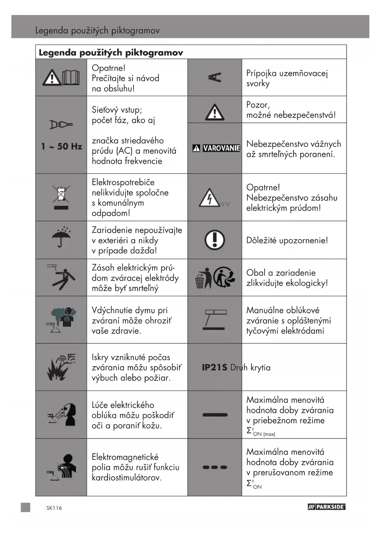 Opatrne! Nebezpečenstvo zásahu elektrickým prúdom! Zariadenie nepoužívajte vexteriéri a nikdy vprípade dažďa! Dôležité upozornenie! Zásah elektrickým prú- dom zváracej elektródy môže byť smrteľný Obal a zariadenie zlikvidujte ekologicky! Vdýchnutie dymu pri zváraní môže ohroziť vaše zdravie. Manuálne oblúkové zváranie s opláštenými tyčovými elektródami Iskry vzniknuté počas zvárania môžu spôsobiť výbuch alebo požiar. IP21S Druh krytia Lúče elektrického oblúka môžu poškodiť oči a poraniť kožu. Maximálna menovitá hodnota doby zvárania v priebežnom režime