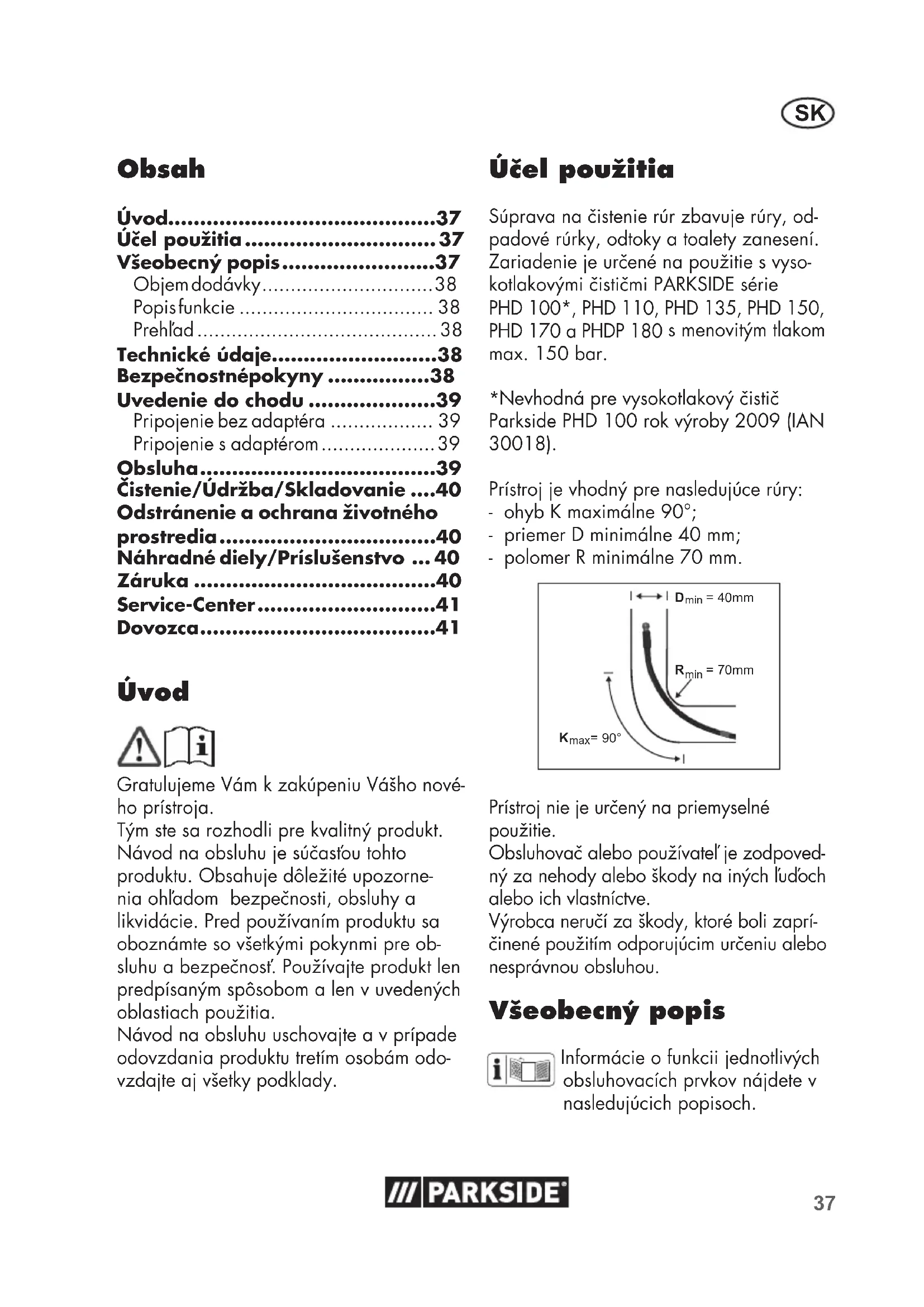 - Nevhodná pre vysokotlakový čistič Parkside PHD 100 rok výroby 2009 (IAN 30018). Prístroj je vhodný pre nasledujúce rúry: - ohyb K maximálne 90°; - priemer D minimálne 40 mm; - polomer R minimálne 70 mm. min D = 40mm min R = 70mm K = 90° max Prístroj nie je určený na priemyselné použitie. Obsluhovač alebo používateľ je zodpoved- ný za nehody alebo škody na iných ľuďoch alebo ich vlastníctve. Výrobca neručí za škody, ktoré boli zaprí- činené použitím odporujúcim určeniu alebo nesprávnou obsluhou. Všeobecný popis Informácie o funkcii jednotlivých obsluhovacích prvkov nájdete v nasledujúcich popisoch. Obsah Úvod p. 37