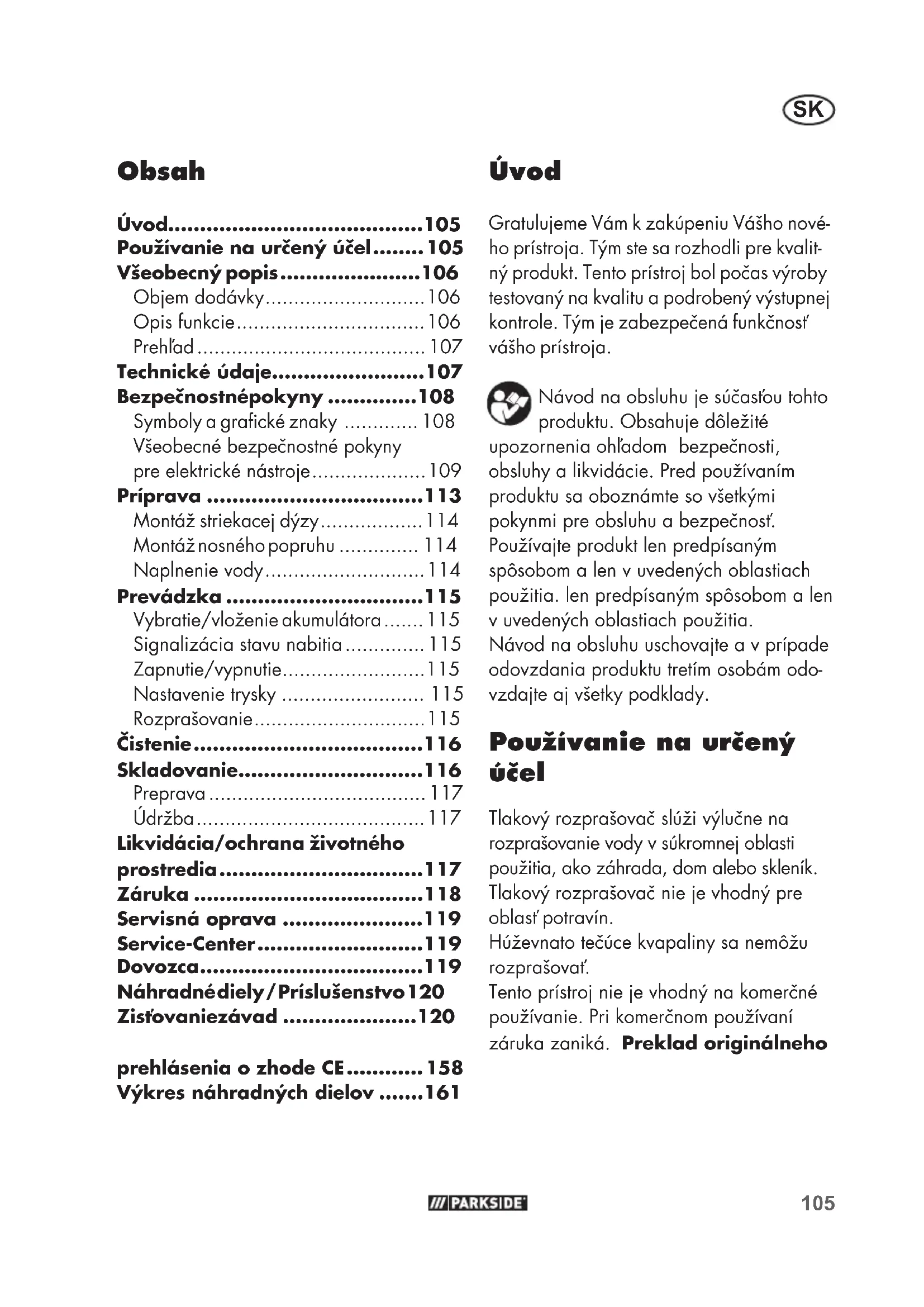 - Úvod Gratulujeme Vám k zakúpeniu Vášho nové- ho prístroja. Tým ste sa rozhodli pre kvalit- ný produkt. Tento prístroj bol počas výroby testovaný na kvalitu a podrobený výstupnej kontrole. Tým je zabezpečená funkčnosť vášho prístroja. Návod na obsluhu je súčasťou tohto produktu. Obsahuje dôležité upozornenia ohľadom bezpečnosti, obsluhy a likvidácie. Pred používaním produktu sa oboznámte so všetkými pokynmi pre obsluhu a bezpečnosť. Používajte produkt len predpísaným spôsobom a len v uvedených oblastiach použitia. len predpísaným spôsobom a len v uvedených oblastiach použitia. Návod na obsluhu uschovajte a v prípade odovzdania produktu tretím osobám odo- vzdajte aj všetky podklady. Používanie na určený účel Tlakový rozprašovač slúži výlučne na rozprašovanie vody v súkromnej oblasti použitia, ako záhrada, dom alebo skleník. Tlakový rozprašovač nie je vhodný pre oblasť potravín. Húževnato tečúce kvapaliny sa nemôžu rozprašovať. Tento prístroj nie je vhodný na komerčné používanie. Pri komerčnom používaní záruka zaniká. Preklad originálneho prehlásenia o zhode CE p. 158