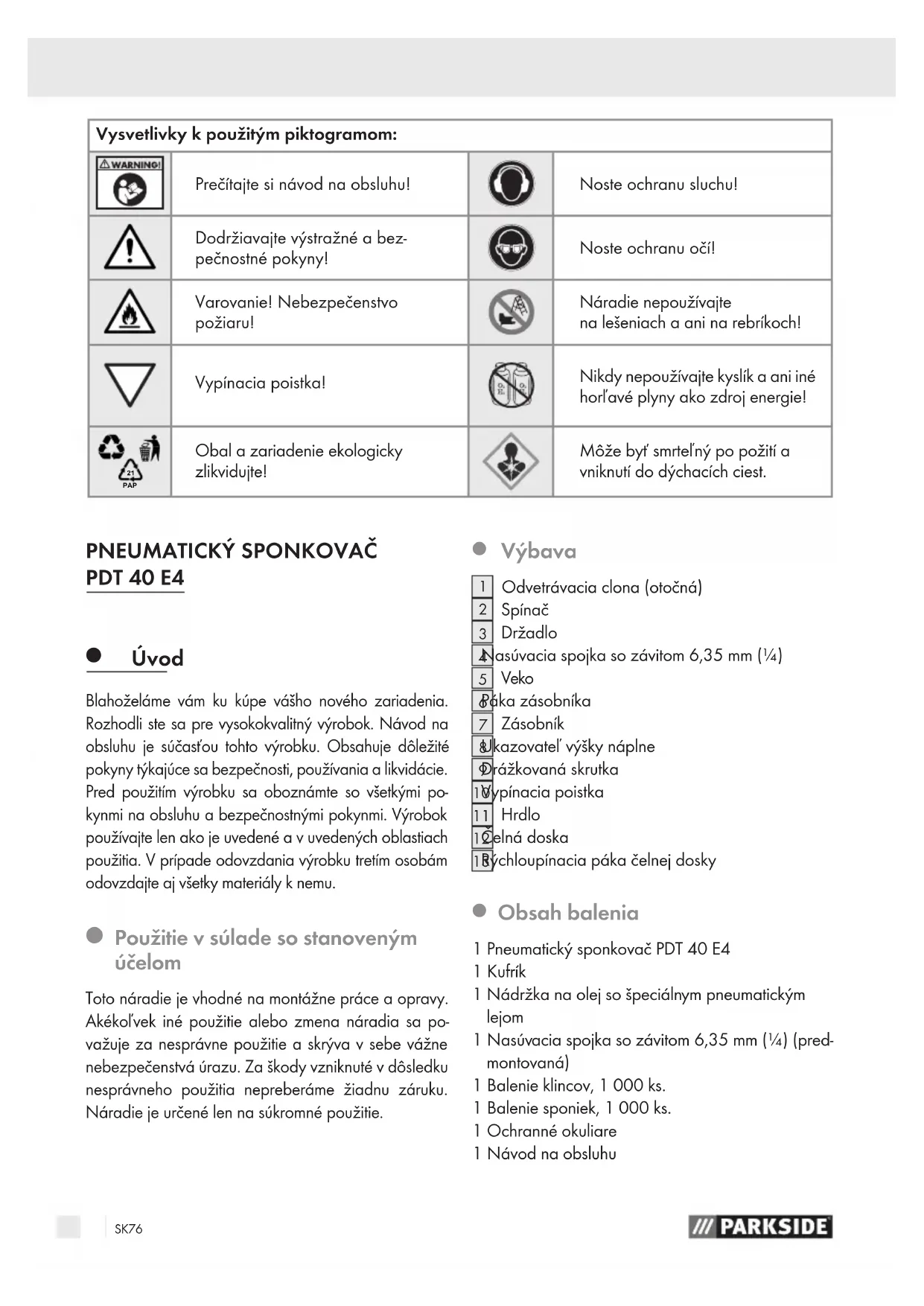 Obsah balenia 1 Pneumatický sponkovač PDT 40 E4 1 Kufrík 1 Nádržka na olej so špeciálnym pneumatickým lejom 1 Nasúvacia spojka so závitom 6,35 mm (¼) (pred- montovaná) 1 Balenie klincov, 1 000 ks. 1 Balenie sponiek, 1 000 ks. 1 Ochranné okuliare 1 Návod na obsluhu Prečítajte si návod na obsluhu! Dodržiavajte výstražné a bez- pečnostné pokyny! Varovanie! Nebezpečenstvo požiaru! Noste ochranu sluchu! Noste ochranu očí! Vypínacia poistka! Náradie nepoužívajte na lešeniach a ani na rebríkoch! Nikdy nepoužívajte kyslík a ani iné horľavé plyny ako zdroj energie! Obal a zariadenie ekologicky zlikvidujte! Vysvetlivky k použitým piktogramom: