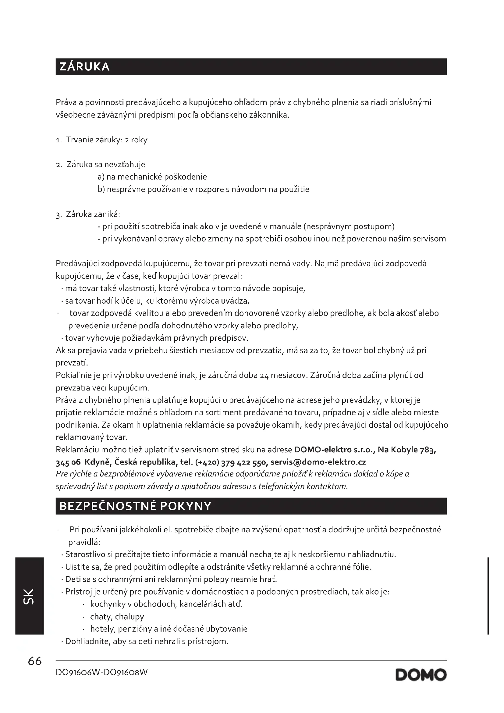 - tovar vyhovuje požiadavkám právnych predpisov. Ak sa prejavia vada v priebehu šiestich mesiacov od prevzatia, má sa za to, že tovar bol chybný už pri prevzatí. Pokiaľ nie je pri výrobku uvedené inak, je záručná doba 24 mesiacov. Záručná doba začína plynúť od prevzatia veci kupujúcim. Práva z chybného plnenia uplatňuje kupujúci u predávajúceho na adrese jeho prevádzky, v ktorej je prijatie reklamácie možné s ohľadom na sortiment predávaného tovaru, prípadne aj v sídle alebo mieste podnikania. Za okamih uplatnenia reklamácie sa považuje okamih, kedy predávajúci dostal od kupujúceho reklamovaný tovar. Reklamáciu možno tiež uplatniť v servisnom stredisku na adrese DOMO-elektro s.r.o., Na Kobyle 783, 345 06 Kdyně, Česká republika, tel. (+420) 379 422 550, servis@domo-elektro.cz Pre rýchle a bezproblémové vybavenie reklamácie odporúčame priložiť k reklamácii doklad o kúpe a sprievodný list s popisom závady a spiatočnou adresou s telefonickým kontaktom.