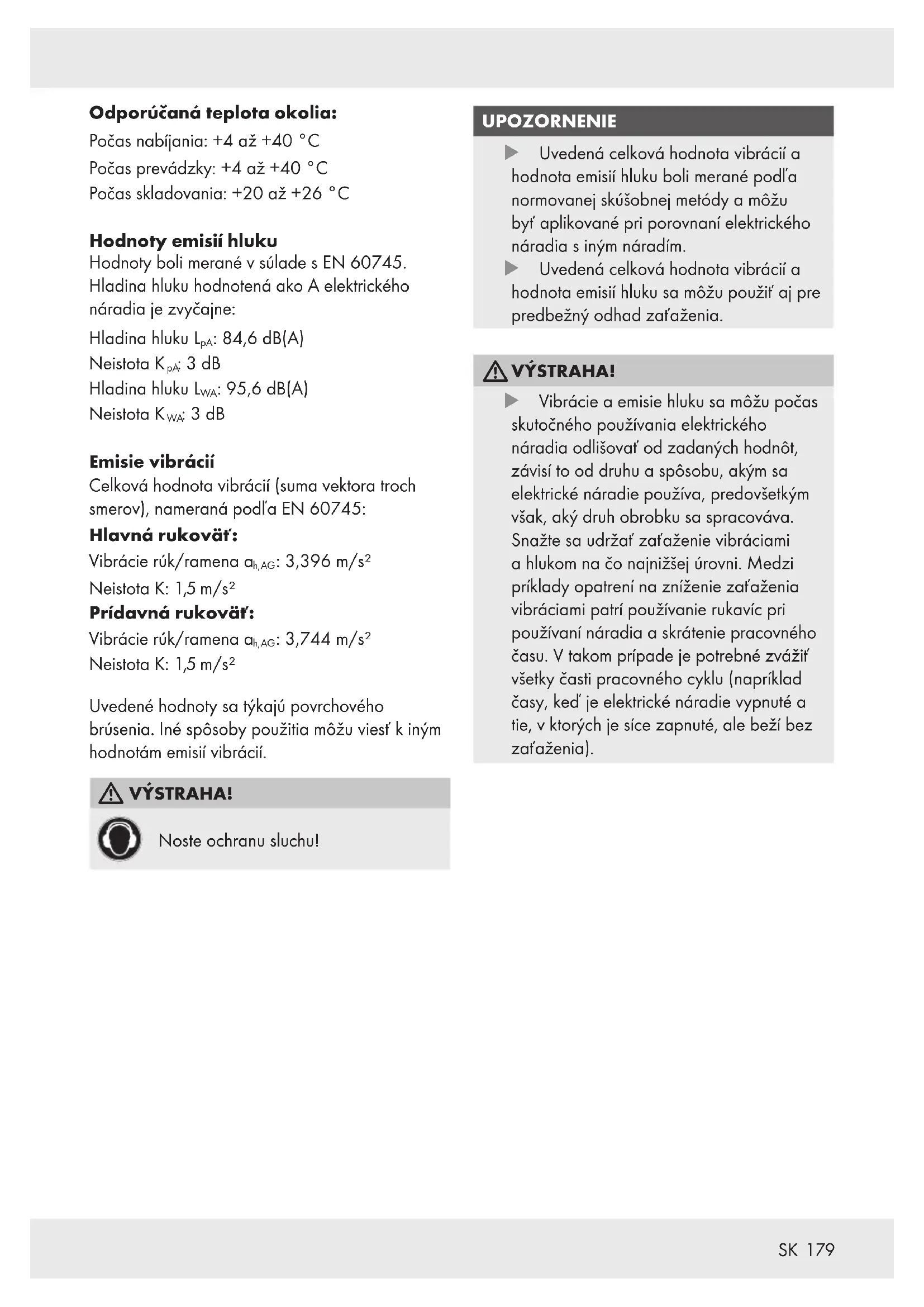 VÝSTRAHA! u Vibrácie a emisie hluku sa môžu počas skutočného používania elektrického náradia odlišovať od zadaných hodnôt, závisí to od druhu a spôsobu, akým sa elektrické náradie používa, predovšetkým však, aký druh obrobku sa spracováva. Snažte sa udržať zaťaženie vibráciami a hlukom na čo najnižšej úrovni. Medzi príklady opatrení na zníženie zaťaženia vibráciami patrí používanie rukavíc pri používaní náradia a skrátenie pracovného času. V takom prípade je potrebné zvážiť všetky časti pracovného cyklu (napríklad časy, keď je elektrické náradie vypnuté a tie, v ktorých je síce zapnuté, ale beží bez zaťaženia).180