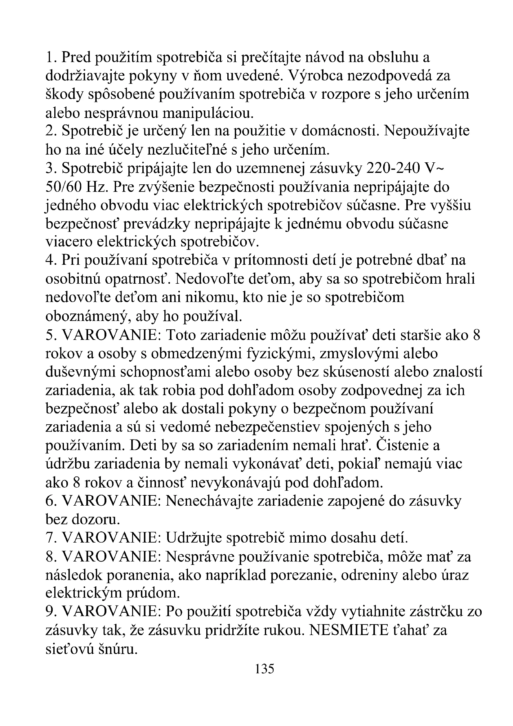 9. VAROVANIE: Po použití spotrebiča vždy vytiahnite zástrčku zo