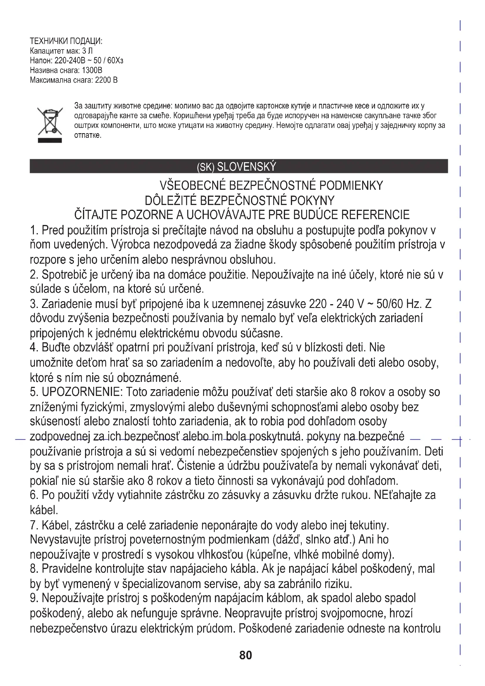 Maximálny výkon: 2200 W TECHNICKÉ DÁTA: Kapacita max: 3 L Napätie: 220 - 240 V ~ 50/60 Hz Nominálny výkon: 1300W Starostlivosť o životné prostredie. Kartónový obal odovzdajte do zberných surovín. Polyetylénové vrecká (PE) vyhoďte do kontajnera na plast. Opotrebený spotrebič odovzdajte na príslušný zberný dvor, nebezpečné látky spotrebiča môžu predstavovať riziko pre životné prostredie. Elektrospotrebič odstráňte tak, aby nedochádzalo j jeho ďalšiemu použitiu. Ak sa v spotrebiči nachádzajú batérie, vyberte ich a odovzdajte ich na zberné miesto osobitne. Spotrebič nevyhadzujte do kontajnera na komunálny odpad! لﺑﻘﺗﺳﻣﻟا ﻲﻓ ﮫﯾﻟإ عوﺟرﻠﻟ ﮫﺑ ظﻔﺗﺣاو ﺔﯾﺎﻧﻌﺑ أرﻗا