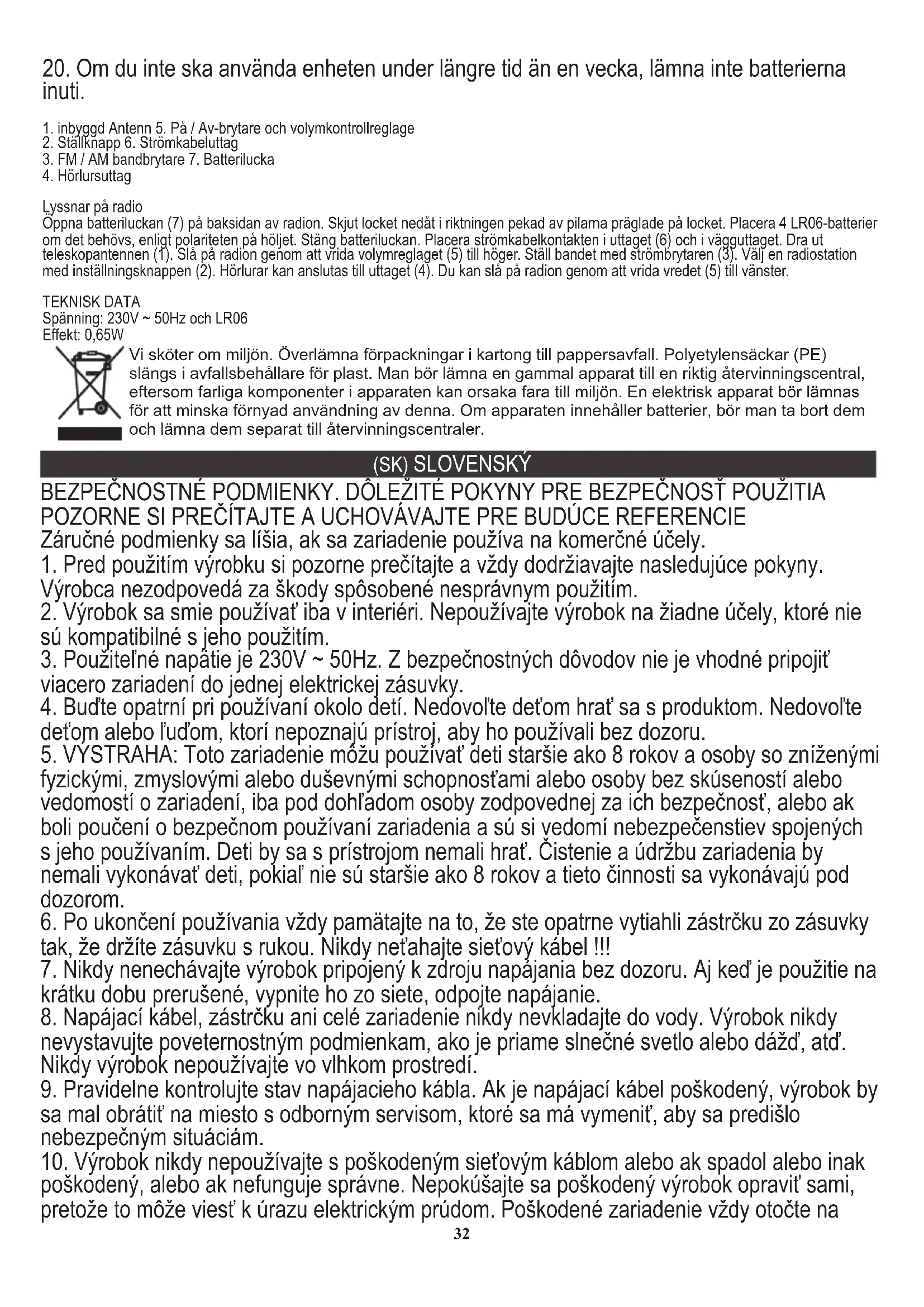 Počúvanie rádia Otvorte kryt batérie (7) na zadnej strane rádia. Posuňte kryt nadol v smere šípok vyrazených na kryte. V prípade potreby umiestnite 4 batérie LR06 dovnútra podľa polarity na kryte. Zatvorte kryt batérie. Zástrčku sieťového kábla vložte do zásuvky (6) a do sieťovej zásuvky. Vytiahnite teleskopickú anténu (1). Zapnite rádio otočením ovládača hlasitosti (5) doprava. Pás nastavte prepínačom (3). Pomocou ladiaceho gombíka (2) vyberte rozhlasovú stanicu. Slúchadlá môžu byť pripojené k zásuvke (4). Rádio môžete zapnúť otočením gombíka (5) doľava.