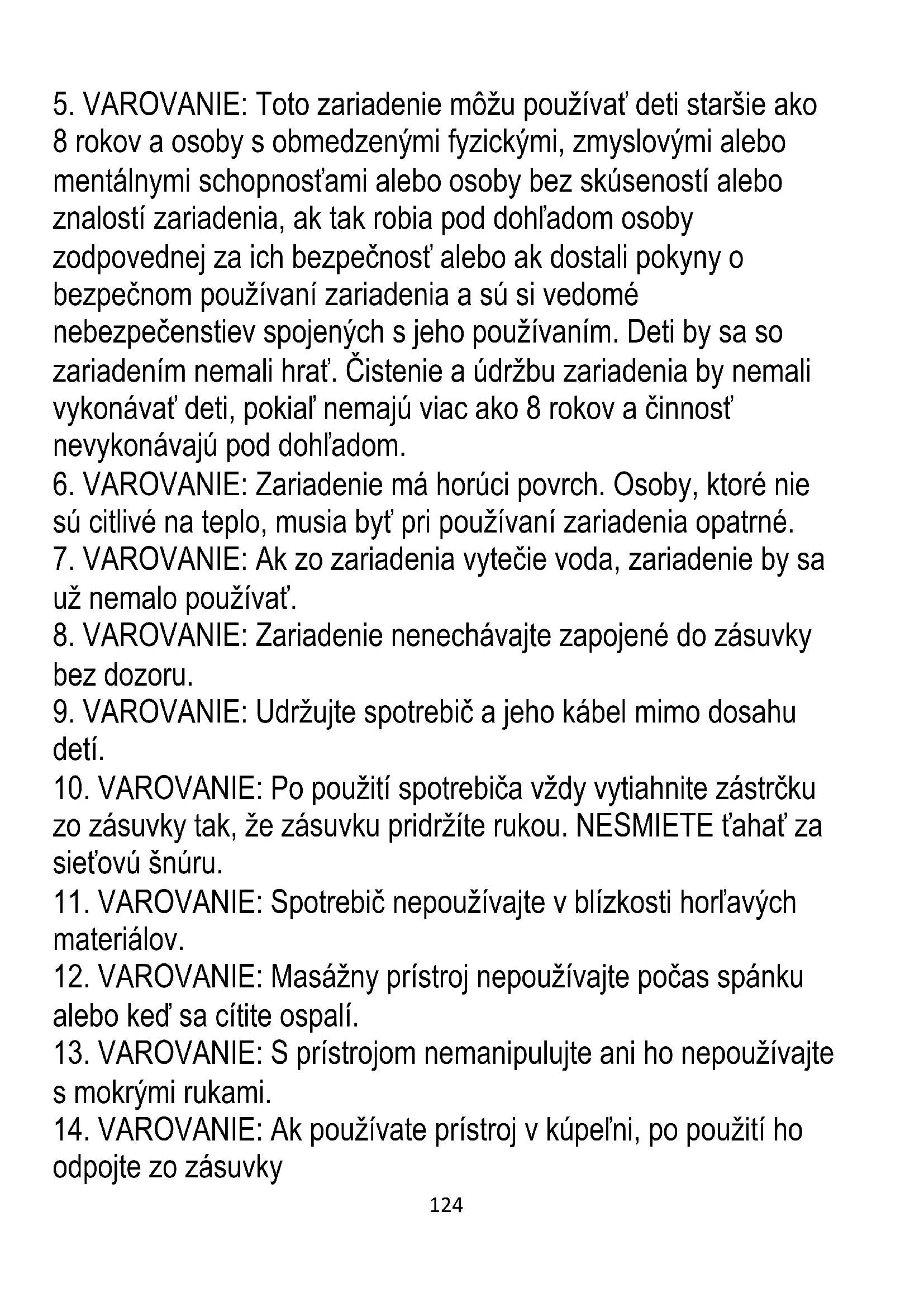 opatrnosť. Nedovoľte deťom, aby sa so spotrebičom hrali nedovoľte, aby ho používali deti alebo osoby, ktoré nie sú so spotrebičom oboznámené.124