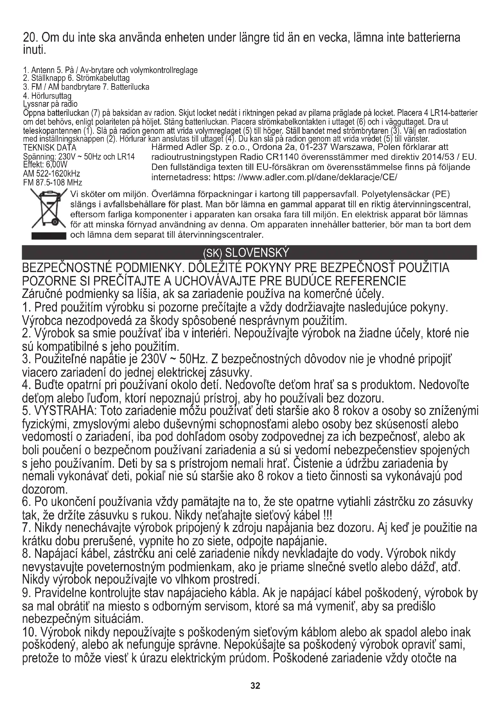 poškodený, alebo ak nefunguje správne. Nepokúšajte sa poškodený výrobok opraviť sami, pretože to môže viesť k úrazu elektrickým prúdom. Poškodené zariadenie vždy otočte na Härmed Adler Sp. z o.o., Ordona 2a, 01-237 Warszawa, Polen förklarar att radioutrustningstypen Radio CR1140 överensstämmer med direktiv 2014/53 / EU. Den fullständiga texten till EU-försäkran om överensstämmelse finns på följande internetadress: https: //www.adler.com.pl/dane/deklaracje/CE/33 odborné servisné miesto, aby ste ho opravili. Všetky opravy môžu vykonávať len autorizovaní servisní pracovníci. Oprava, ktorá bola vykonaná nesprávne, môže spôsobiť nebezpečné situácie pre používateľa.