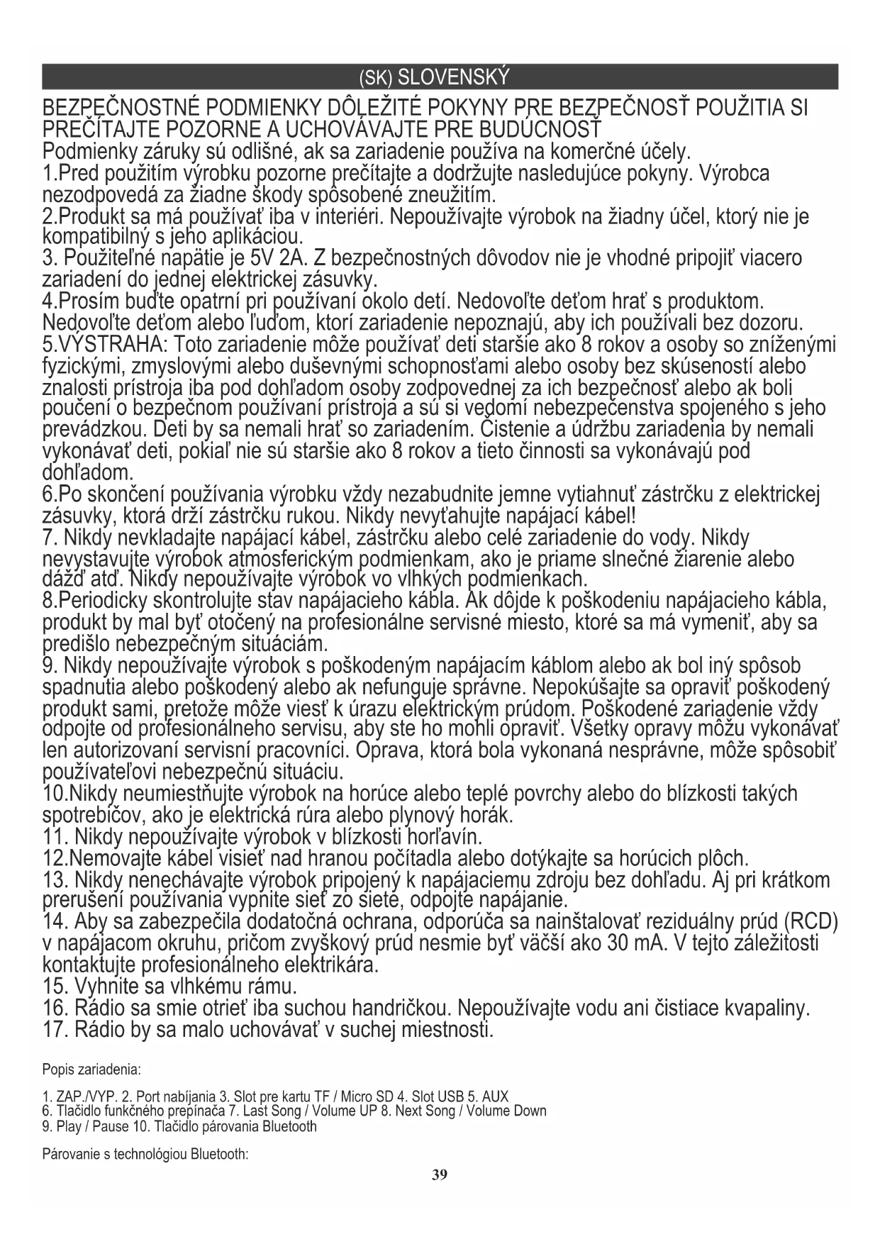 Párovanie s technológiou Bluetooth: 39Ak chcete spárova »zariadenie s Bluetooth kompatibilným zariadením, zapnite prístroj. Po krátkom upozornení je prístroj pripravený na párovanie. Na vašom prístroji vyhľadajte názov „CR1170“ a pripojte są. Ak chcete spárovať iné zariadenie, stlačte tlačidlo párovania Bluetooth (10) a vyhľadajte názov „CR1170“ a pripojte sa k zariadeniu kompatibilnému s Bluetooth. Prepínacie režimy: Prepínanie medzi Bluetooth, USB, TF / SD kartou. Stlačte tlačidlo funkčného prepínača „M.“ (6). Vezmite prosím na vedomie, že najprv musíte vložiť buď USB kľúč alebo TF / SD kartu do zariadenia, aby ste sa mohli stať dostupnými. Ak sa v príslušnom slote nenachádza žiadna karta USB alebo SD, zariadenie sa neprepne z režimu Bluetooth. Funkčné tlačidlá: Tlačidlo Posledná skladba / Zvýšenie hlasitosti (7): Krátkym stlačením tlačidla zmeníte aktuálnu skladbu na predchádzajúcu. Dlhým stlačením zvýšite hlasitosť. Nasledujúca skladba / Tlačidlo zníženia hlasitosti (8): Krátkym stlačením tlačidla zmeníte aktuálnu skladbu na nasledujúcu. Dlhým stlačením znížite hlasitosť. Tlačidlo Pause / Play (9): Krátkym stlačením pozastavíte alebo prehráte aktuálnu skladbu. Pri opakovanom volaní krátkym stlačením prijmete hovor a krátkym stlačením znova ukončíte hovor. Karta TF / SD: Zariadenie podporuje SD kartu s kapacitou až 32 GB. USB: Zariadenie podporuje USB kľúče do 32 GB a len vo formáte FAT32. Technické špecifikácie: Čas prehrávania: 8-10H Vstup: 5V 2A Doba nabíjania: 120Min Bezdrôtový prenos: až 10M Starostlivosť o životné prostredie. Kartónový obal odovzdajte do zberných surovín. Polyetylénové vrecká (PE) vyhoďte do kontajnera na plast. Opotrebený spotrebič odovzdajte na príslušný zberný dvor, nebezpečné látky spotrebiča môžu predstavovať riziko pre životné prostredie. Elektrospotrebič odstráňte tak, aby nedochádzalo j jeho ďalšiemu použitiu. Ak sa v spotrebiči nachádzajú batérie, vyberte ich a odovzdajte ich na zberné miesto osobitne. Spotrebič nevyhadzujte do kontajnera na komunálny odpad! (IT) ITALIANO CONDIZIONI DI SICUREZZA ISTRUZIONI IMPORTANTI SULLA SICUREZZA DELL'USO LEGGERE ATTENTAMENTE E CONSERVARE PER FUTURE RIFERIMENTI Le condizioni di garanzia sono diverse se il dispositivo viene utilizzato per scopi commerciali. 1.Prima di utilizzare il prodotto, leggere attentamente e rispettare sempre le seguenti istruzioni. Il produttore non è responsabile per eventuali danni dovuti a qualsiasi uso improprio.