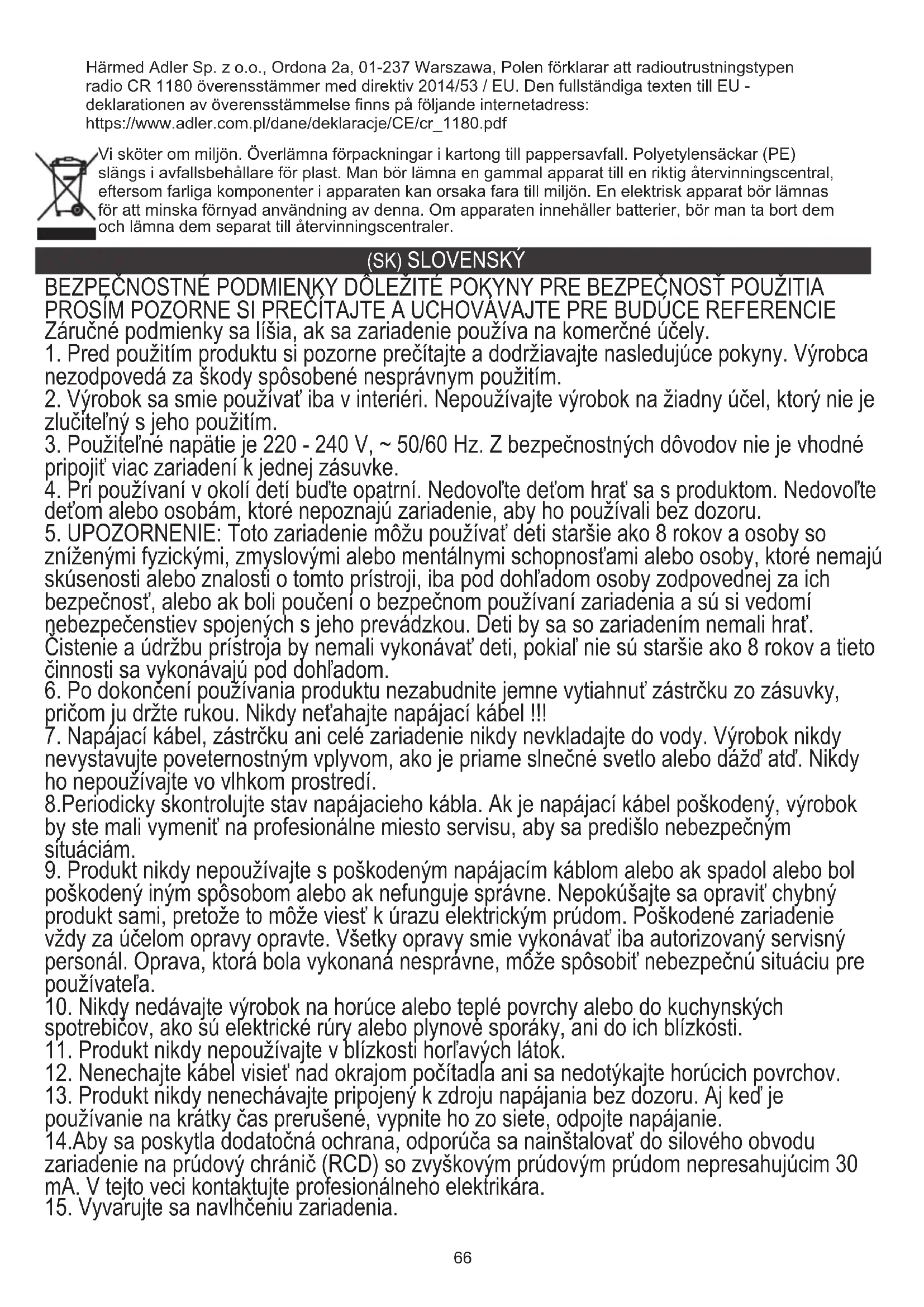 Starostlivosť o životné prostredie. Kartónový obal odovzdajte do zberných surovín. Polyetylénové vrecká (PE) vyhoďte do kontajnera na plast. Opotrebený spotrebič odovzdajte na príslušný zberný dvor, nebezpečné látky spotrebiča môžu predstavovať riziko pre životné prostredie. Elektrospotrebič odstráňte tak, aby nedochádzalo j jeho ďalšiemu použitiu. Ak sa v spotrebiči nachádzajú batérie, vyberte ich a odovzdajte ich na zberné miesto osobitne. Spotrebič Týmto spoločnosť Adler Sp. z o.o., Ordona 2a, 01-237 Varšava, Poľsko vyhlasuje, že typ rádiového zariadenia rádio CR 1180 je v súlade so smernicou 2014/53 / EÚ. Úplné znenie vyhlásenia EÚ z zhoda je k dispozícii na tejto internetovej adrese: https://www.adler.com.pl/dane/deklaracje/CE/cr_1180.pdf69 (IT) ITALIANO CONDIZIONI DI SICUREZZA ISTRUZIONI IMPORTANTI SULLA SICUREZZA D'USO LEGGERE ATTENTAMENTE E CONSERVARE IL FUTURO RIFERIMENTO Le condizioni di garanzia sono diverse se il dispositivo viene utilizzato a fini commerciali.