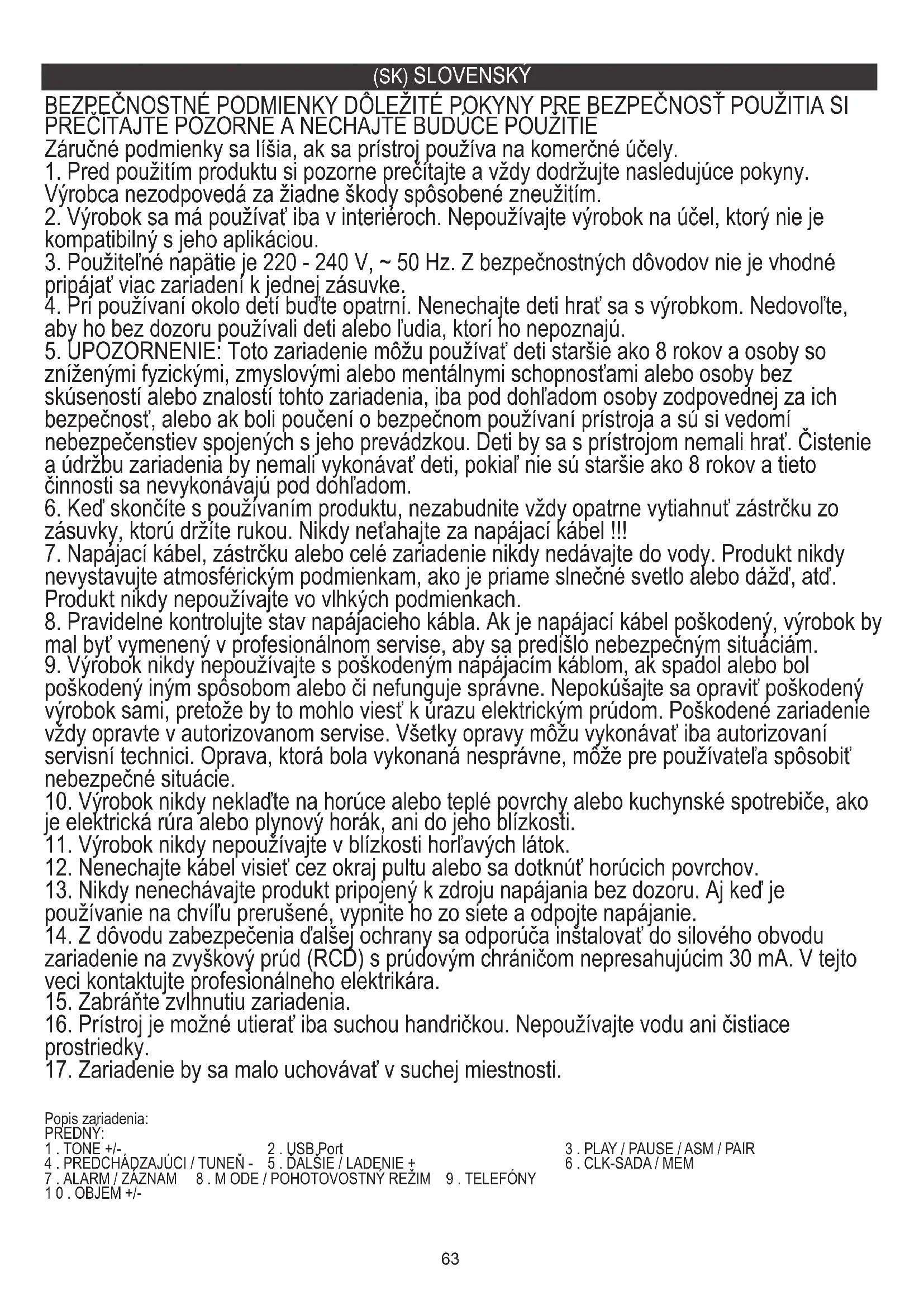 17. Zariadenie by sa malo uchovávať v suchej miestnosti.