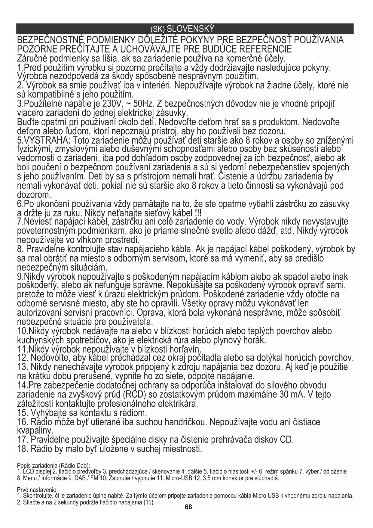 Ruší sa zvukový alarm Stlačením pohotovostného režimu (10) zrušíte akýkoľvek zvukový signál alebo stlačením tlačidla Source zrušíte a necháte rádio zapnuté. Odklad zvukovej výstrahy Ak chcete odložiť zvonenie budíka, stlačte tlačidlo Select / Snooze (7). Na displeji sa zobrazí odpočítavanie času, ktoré ukáže, ako dlho budík odloží. Ak chcete upraviť čas, ktorý bude budík odkladať, stlačením tlačidla Continuous Select / Snooze (7) zmeňte trvanie odloženia v 5-minútových intervaloch až na 15 minút a potom 30 minút. Na zrušenie budíka stlačte tlačidlo Standby (10). Digitálne frekvencie: pásmo III 174 - 240 MHz, FM: 87,5 - 108 MHz Príjem napájacieho zdroja 5V (1A) DC micro-USB (kábel je súčasťou dodávky) Lítium-iónová nabíjateľná batéria (2000 mAh) Vstupy 5 V DC (1A) Micro-USB napájacia zásuvka Starostlivosť o životné prostredie. Kartónový obal odovzdajte do zberných surovín. Polyetylénové vrecká (PE) vyhoďte do kontajnera na plast. Opotrebený spotrebič odovzdajte na príslušný zberný dvor, nebezpečné látky spotrebiča môžu predstavovať riziko pre životné prostredie. Elektrospotrebič odstráňte tak, aby nedochádzalo j jeho ďalšiemu použitiu. Ak sa v spotrebiči nachádzajú batérie, vyberte ich a odovzdajte ich na zberné miesto osobitne. Spotrebič nevyhadzujte do kontajnera na komunálny odpad!71 (SR) СРПСКИ УСЛОВИ ЗА СИГУРНОСТ ВАЖНЕ УПУТЕ О СИГУРНОСТИ УПОТРЕБЕ МОЛИМО ВАС ДА ПРОЧИТАТЕ И ЧУВАЈТЕ ЗА БУДУЋЕ РЕФЕРЕНЦЕ Услови гаранције су различити, ако се уређај користи у комерцијалне сврхе.