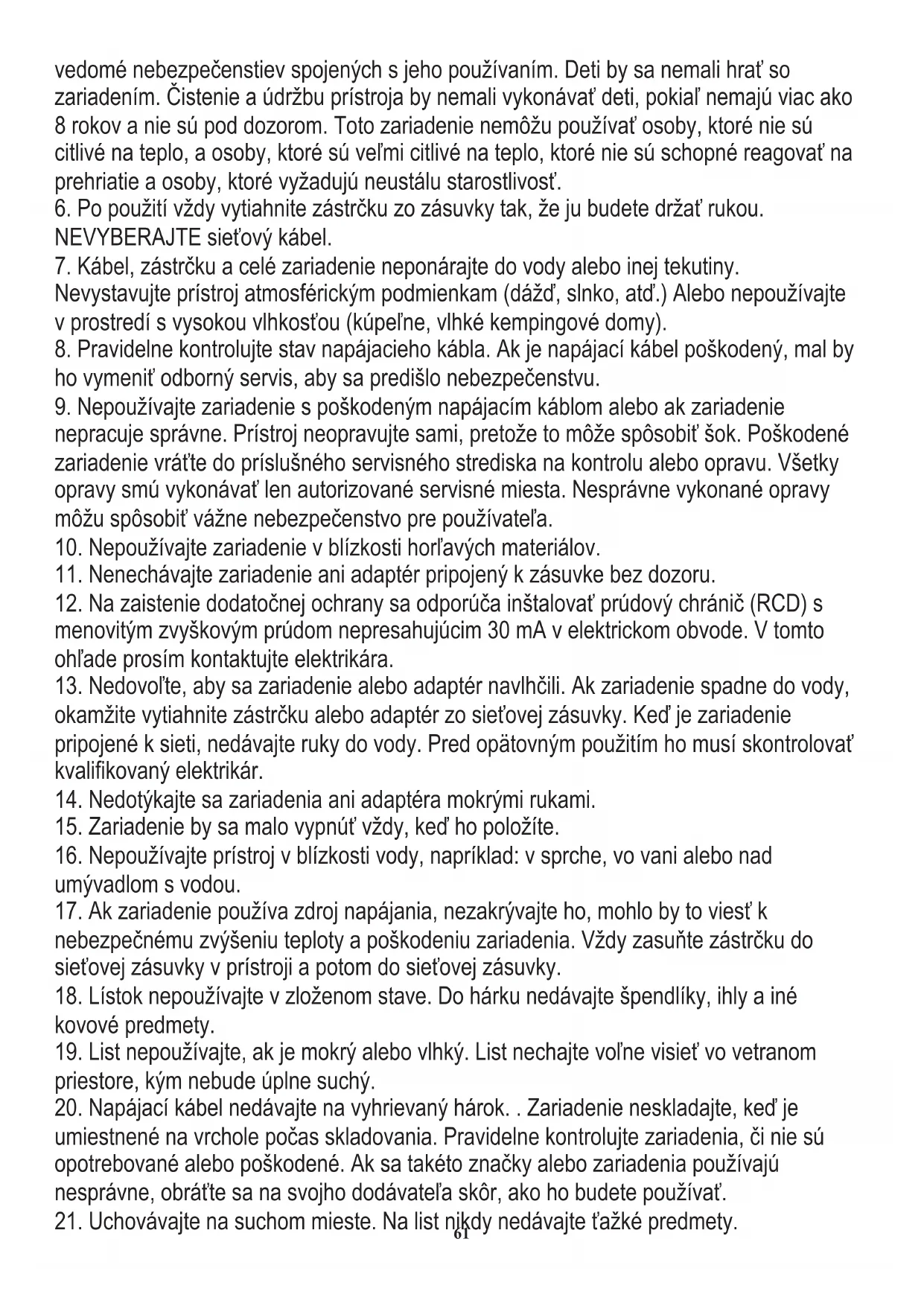 20. Napájací kábel nedávajte na vyhrievaný hárok. . Zariadenie neskladajte, keď je