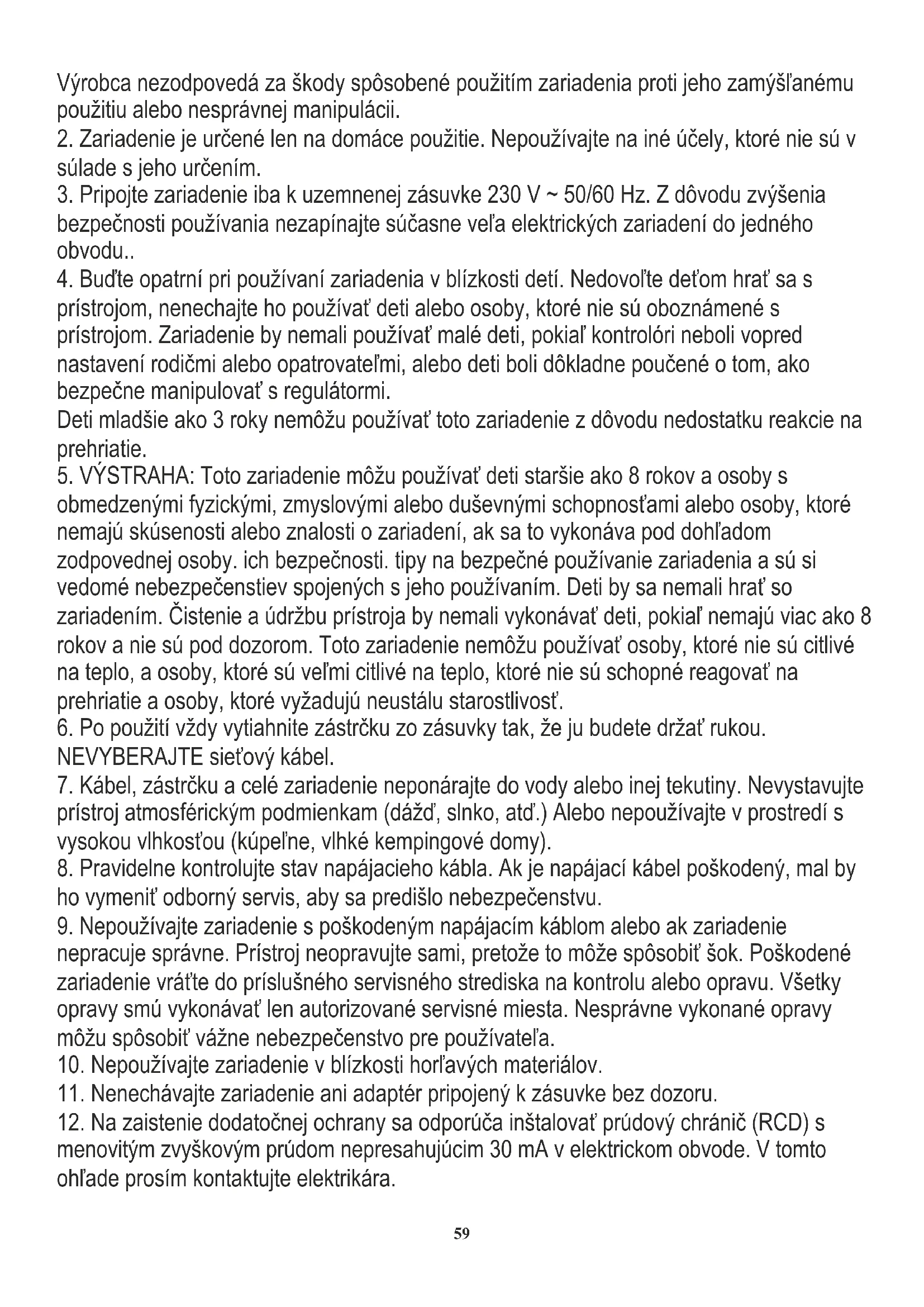obmedzenými fyzickými, zmyslovými alebo duševnými schopnosťami alebo osoby, ktoré nemajú skúsenosti alebo znalosti o zariadení, ak sa to vykonáva pod dohľadom zodpovednej osoby. ich bezpečnosti. tipy na bezpečné používanie zariadenia a sú si vedomé nebezpečenstiev spojených s jeho používaním. Deti by sa nemali hrať so zariadením. Čistenie a údržbu prístroja by nemali vykonávať deti, pokiaľ nemajú viac ako 8 rokov a nie sú pod dozorom. Toto zariadenie nemôžu používať osoby, ktoré nie sú citlivé na teplo, a osoby, ktoré sú veľmi citlivé na teplo, ktoré nie sú schopné reagovať na prehriatie a osoby, ktoré vyžadujú neustálu starostlivosť.