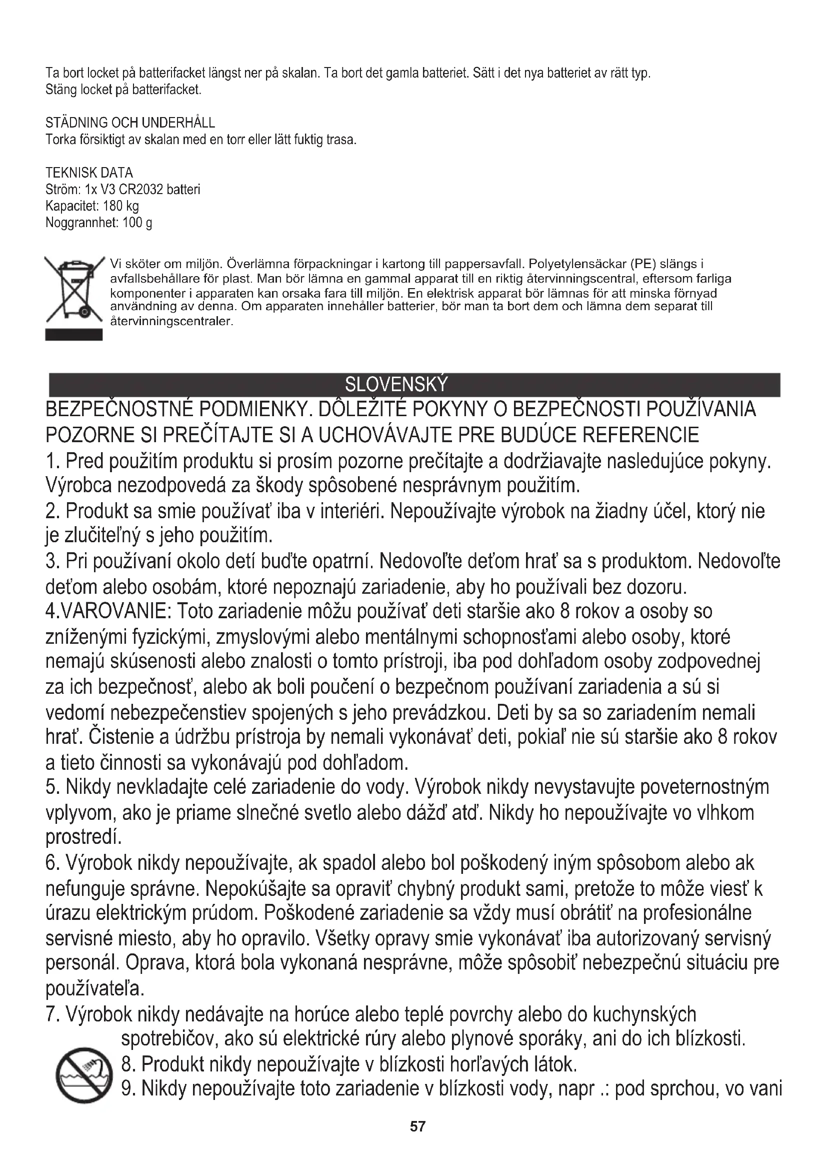 Starostlivosť o životné prostredie. Kartónový obal odovzdajte do zberných surovín. Polyetylénové vrecká (PE) vyhoďte do kontajnera na plast. Opotrebený spotrebič odovzdajte na príslušný zberný dvor, nebezpečné látky spotrebiča môžu predstavovať riziko pre životné prostredie. Elektrospotrebič odstráňte tak, aby nedochádzalo j jeho ďalšiemu použitiu. Ak sa v spotrebiči nachádzajú batérie, vyberte ich a odovzdajte ich na zberné miesto osobitne. Spotrebič nevyhadzujte do kontajnera na komunálny odpad!