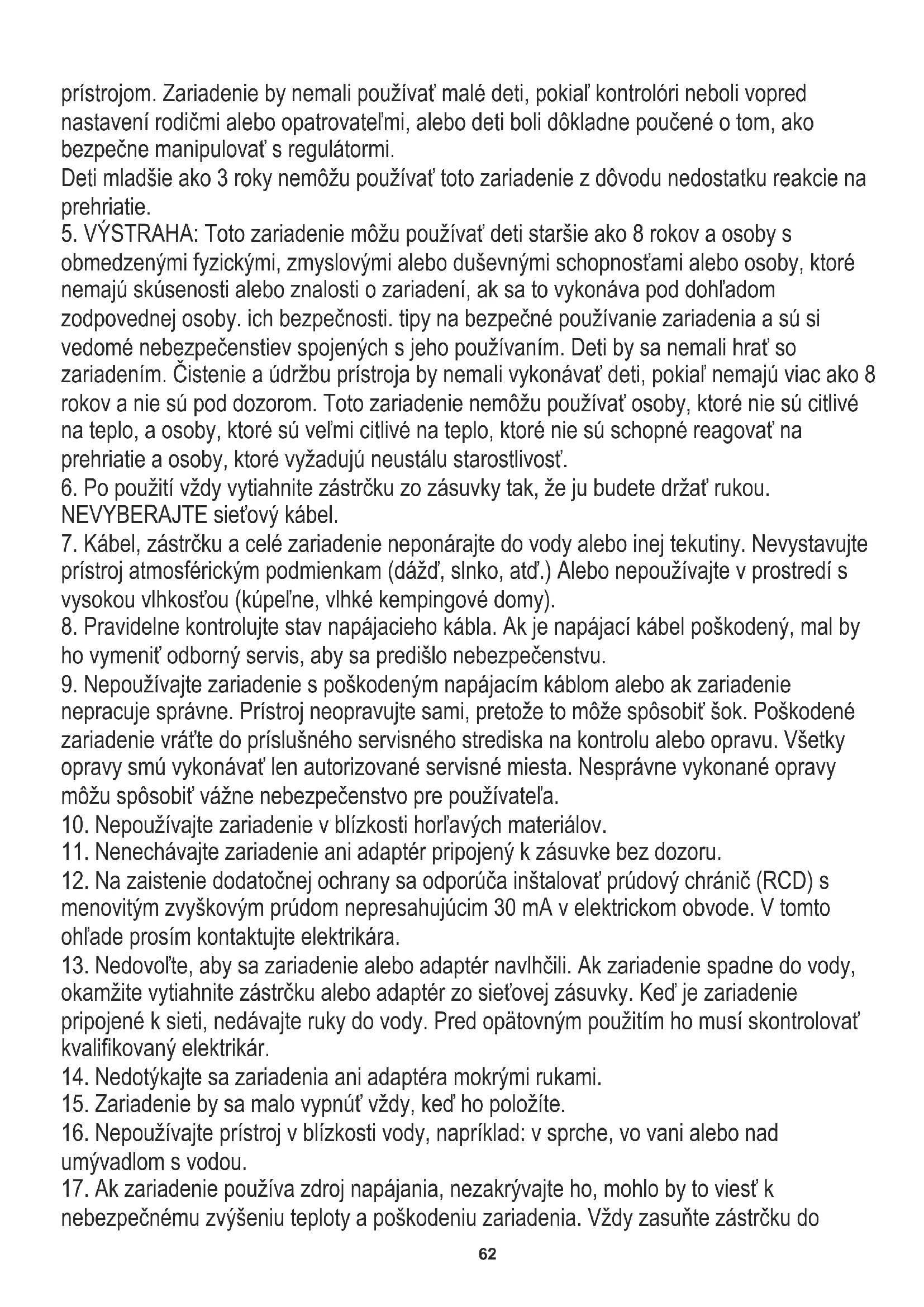 obmedzenými fyzickými, zmyslovými alebo duševnými schopnosťami alebo osoby, ktoré nemajú skúsenosti alebo znalosti o zariadení, ak sa to vykonáva pod dohľadom zodpovednej osoby. ich bezpečnosti. tipy na bezpečné používanie zariadenia a sú si vedomé nebezpečenstiev spojených s jeho používaním. Deti by sa nemali hrať so zariadením. Čistenie a údržbu prístroja by nemali vykonávať deti, pokiaľ nemajú viac ako 8 rokov a nie sú pod dozorom. Toto zariadenie nemôžu používať osoby, ktoré nie sú citlivé na teplo, a osoby, ktoré sú veľmi citlivé na teplo, ktoré nie sú schopné reagovať na prehriatie a osoby, ktoré vyžadujú neustálu starostlivosť.