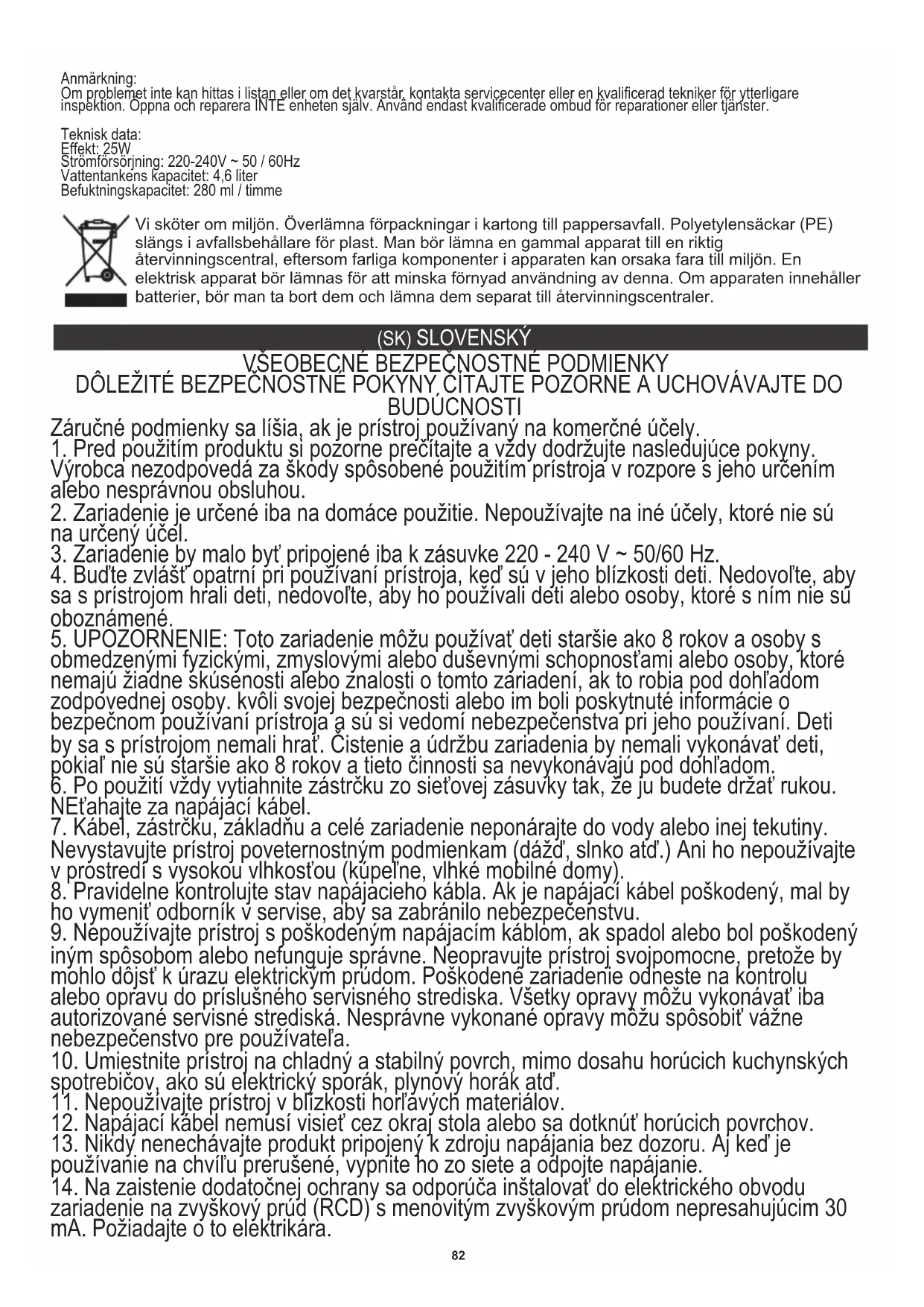 zariadenie na zvyškový prúd (RCD) s menovitým zvyškovým prúdom nepresahujúcim 30 mA. Požiadajte o to elektrikára. Vi sköter om miljön. Överlämna förpackningar i kartong till pappersavfall. Polyetylensäckar (PE) slängs i avfallsbehållare för plast. Man bör lämna en gammal apparat till en riktig återvinningscentral, eftersom farliga komponenter i apparaten kan orsaka fara till miljön. En elektrisk apparat bör lämnas för att minska förnyad användning av denna. Om apparaten innehåller batterier, bör man ta bort dem och lämna dem separat till återvinningscentraler. (SK) SLOVENSKÝ Anmärkning: Om problemet inte kan hittas i listan eller om det kvarstår, kontakta servicecenter eller en kvalificerad tekniker för ytterligare inspektion. Öppna och reparera INTE enheten själv. Använd endast kvalificerade ombud för reparationer eller tjänster. Teknisk data: Effekt: 25W Strömförsörjning: 220-240V ~ 50 / 60Hz Vattentankens kapacitet: 4,6 liter Befuktningskapacitet: 280 ml / timme83