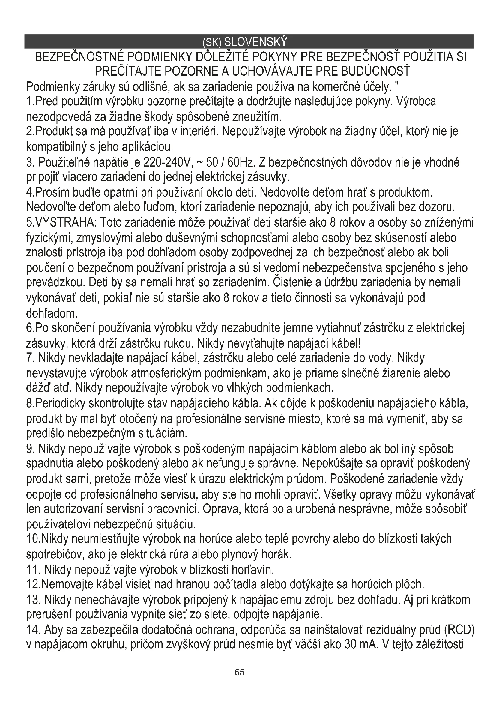 pripojiť viacero zariadení do jednej elektrickej zásuvky. 4.Prosím buďte opatrní pri používaní okolo detí. Nedovoľte deťom hrať s produktom. Nedovoľte deťom alebo ľuďom, ktorí zariadenie nepoznajú, aby ich používali bez dozoru. 5.VÝSTRAHA: Toto zariadenie môže používať deti staršie ako 8 rokov a osoby so zníženými fyzickými, zmyslovými alebo duševnými schopnosťami alebo osoby bez skúseností alebo znalosti prístroja iba pod dohľadom osoby zodpovednej za ich bezpečnosť alebo ak boli poučení o bezpečnom používaní prístroja a sú si vedomí nebezpečenstva spojeného s jeho prevádzkou. Deti by sa nemali hrať so zariadením. Čistenie a údržbu zariadenia by nemali vykonávať deti, pokiaľ nie sú staršie ako 8 rokov a tieto činnosti sa vykonávajú pod dohľadom. 6.Po skončení používania výrobku vždy nezabudnite jemne vytiahnuť zástrčku z elektrickej zásuvky, ktorá drží zástrčku rukou. Nikdy nevyťahujte napájací kábel!