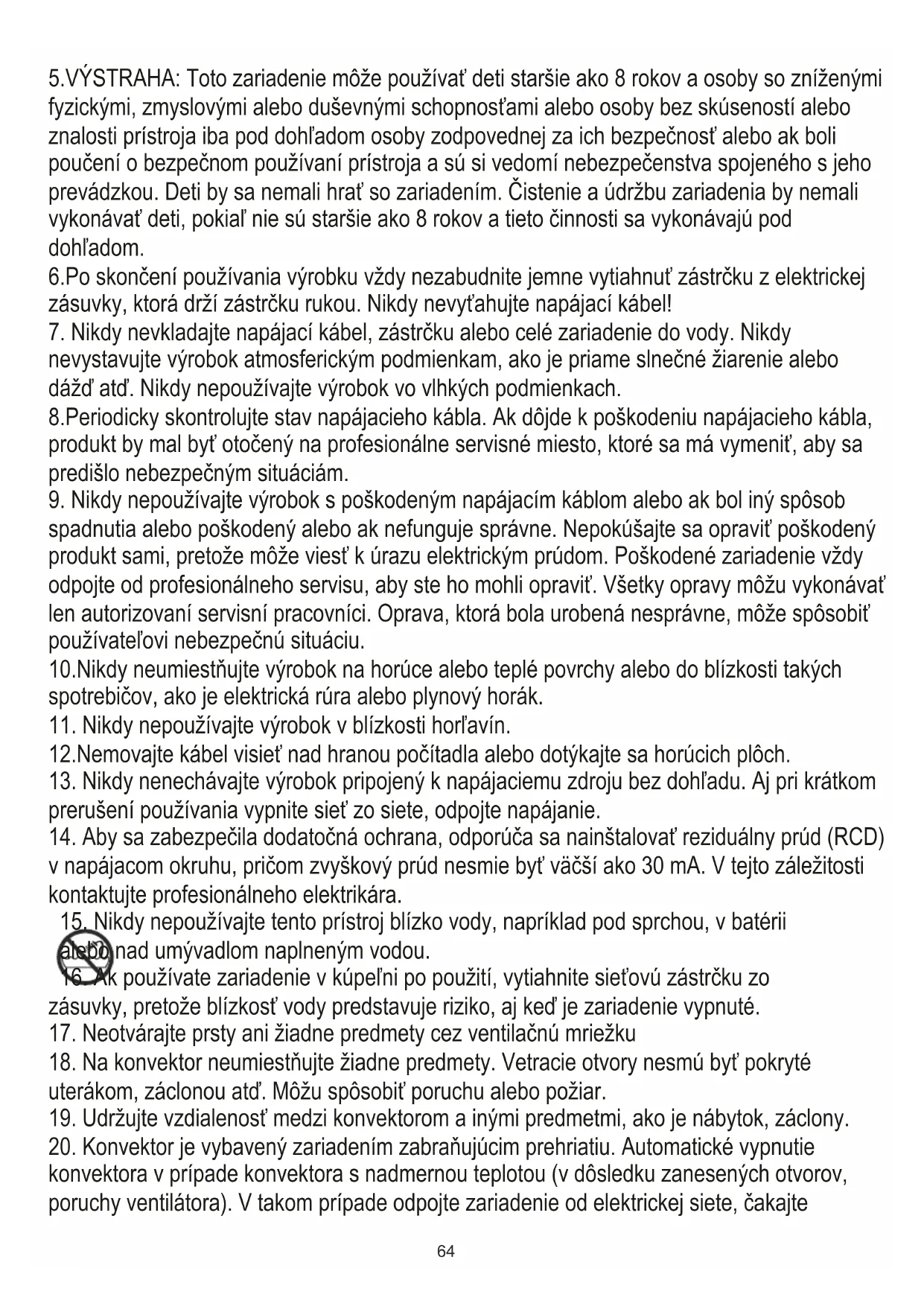 18. Na konvektor neumiestňujte žiadne predmety. Vetracie otvory nesmú byť pokryté