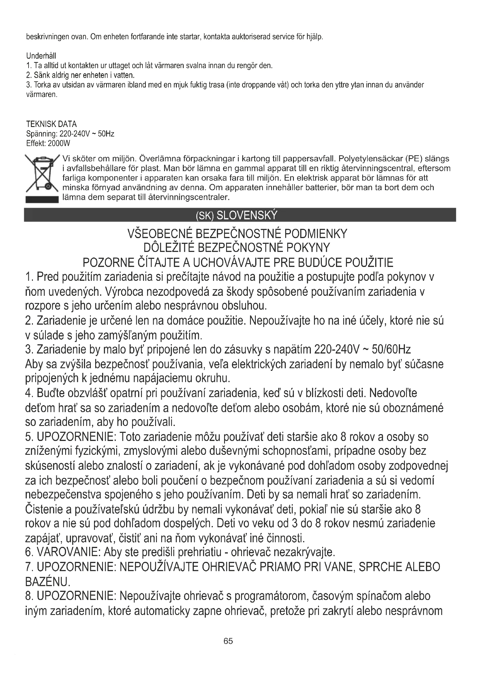 zníženými fyzickými, zmyslovými alebo duševnými schopnosťami, prípadne osoby bez skúseností alebo znalostí o zariadení, ak je vykonávané pod dohľadom osoby zodpovednej za ich bezpečnosť alebo boli poučení o bezpečnom používaní zariadenia a sú si vedomí nebezpečenstva spojeného s jeho používaním. Deti by sa nemali hrať so zariadením. Čistenie a používateľskú údržbu by nemali vykonávať deti, pokiaľ nie sú staršie ako 8 rokov a nie sú pod dohľadom dospelých. Deti vo veku od 3 do 8 rokov nesmú zariadenie zapájať, upravovať, čistiť ani na ňom vykonávať iné činnosti.