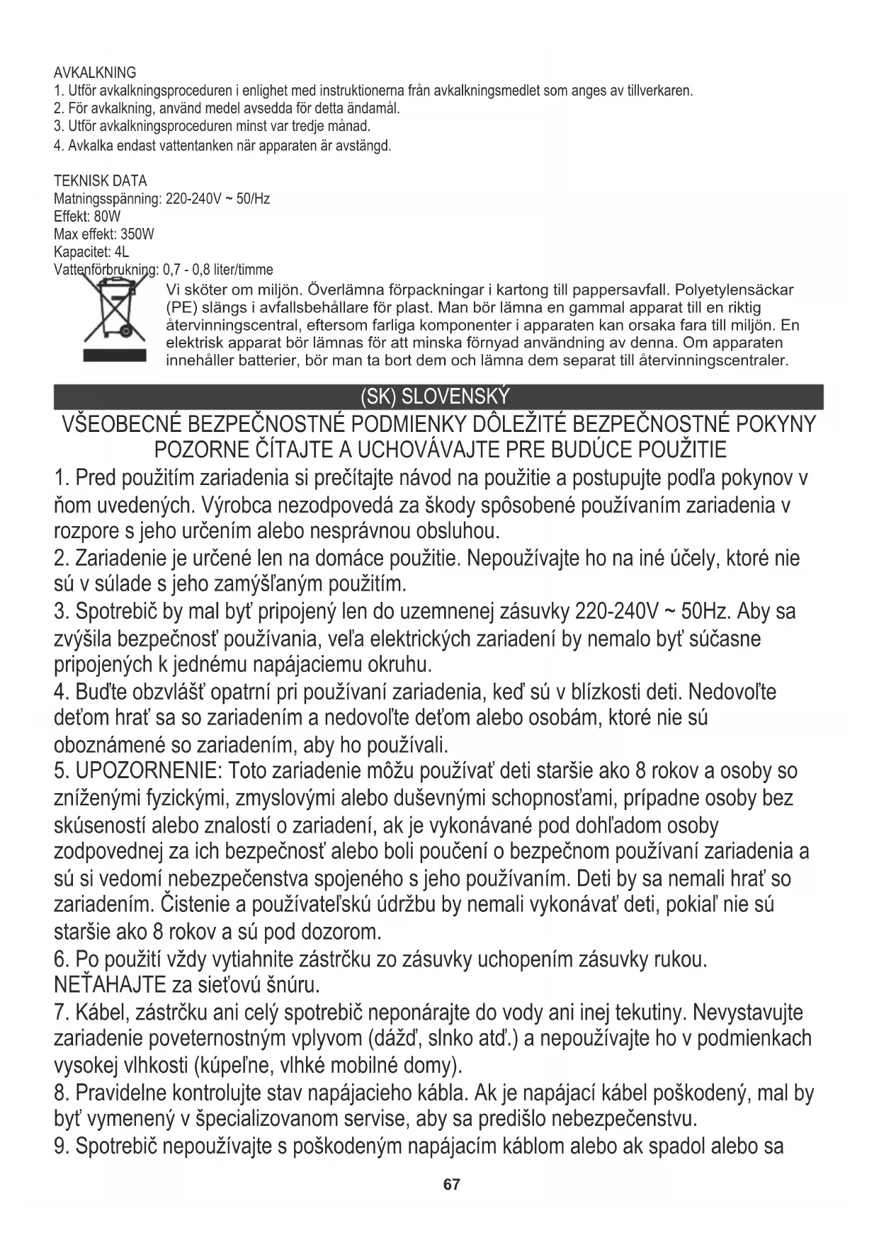 TEKNISK DATA Matningsspänning: 220-240V ~ 50/Hz Effekt: 80W Max effekt: 350W Kapacitet: 4L Vattenförbrukning: 0,7 - 0,8 liter/timme68 poškodil iným spôsobom alebo nefunguje správne. Zariadenie sami neopravujte, pretože by mohlo dôjsť k úrazu elektrickým prúdom. Vráťte poškodené zariadenie do príslušného servisného strediska na kontrolu alebo opravu. Akékoľvek opravy môžu vykonávať iba autorizované servisné strediská. Nesprávne vykonaná oprava môže spôsobiť vážne nebezpečenstvo pre používateľa.
