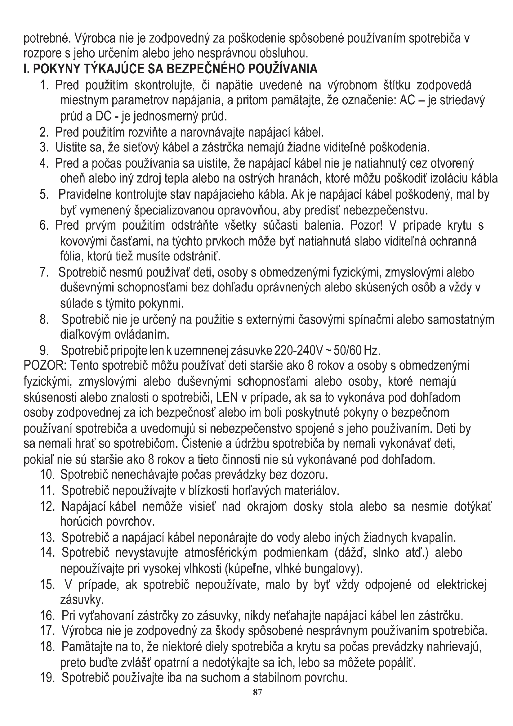 POZOR: Tento spotrebič môžu používať deti staršie ako 8 rokov a osoby s obmedzenými fyzickými, zmyslovými alebo duševnými schopnosťami alebo osoby, ktoré nemajú skúsenosti alebo znalosti o spotrebiči, LEN v prípade, ak sa to vykonáva pod dohľadom osoby zodpovednej za ich bezpečnosť alebo im boli poskytnuté pokyny o bezpečnom používaní spotrebiča a uvedomujú si nebezpečenstvo spojené s jeho používaním. Deti by sa nemali hrať so spotrebičom. Čistenie a údržbu spotrebiča by nemali vykonávať deti, pokiaľ nie sú staršie ako 8 rokov a tieto činnosti nie sú vykonávané pod dohľadom.