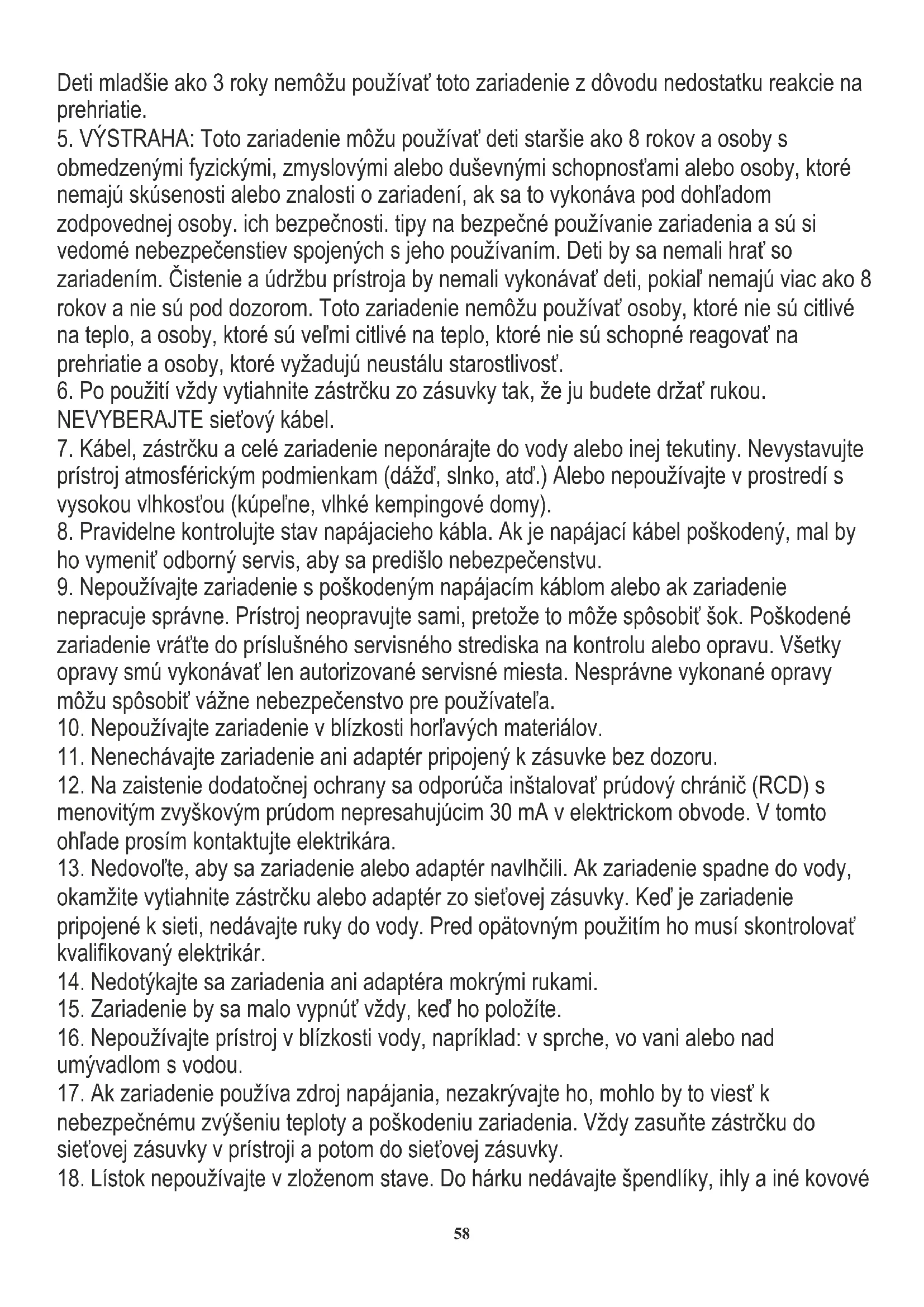 obmedzenými fyzickými, zmyslovými alebo duševnými schopnosťami alebo osoby, ktoré nemajú skúsenosti alebo znalosti o zariadení, ak sa to vykonáva pod dohľadom zodpovednej osoby. ich bezpečnosti. tipy na bezpečné používanie zariadenia a sú si vedomé nebezpečenstiev spojených s jeho používaním. Deti by sa nemali hrať so zariadením. Čistenie a údržbu prístroja by nemali vykonávať deti, pokiaľ nemajú viac ako 8 rokov a nie sú pod dozorom. Toto zariadenie nemôžu používať osoby, ktoré nie sú citlivé na teplo, a osoby, ktoré sú veľmi citlivé na teplo, ktoré nie sú schopné reagovať na prehriatie a osoby, ktoré vyžadujú neustálu starostlivosť.