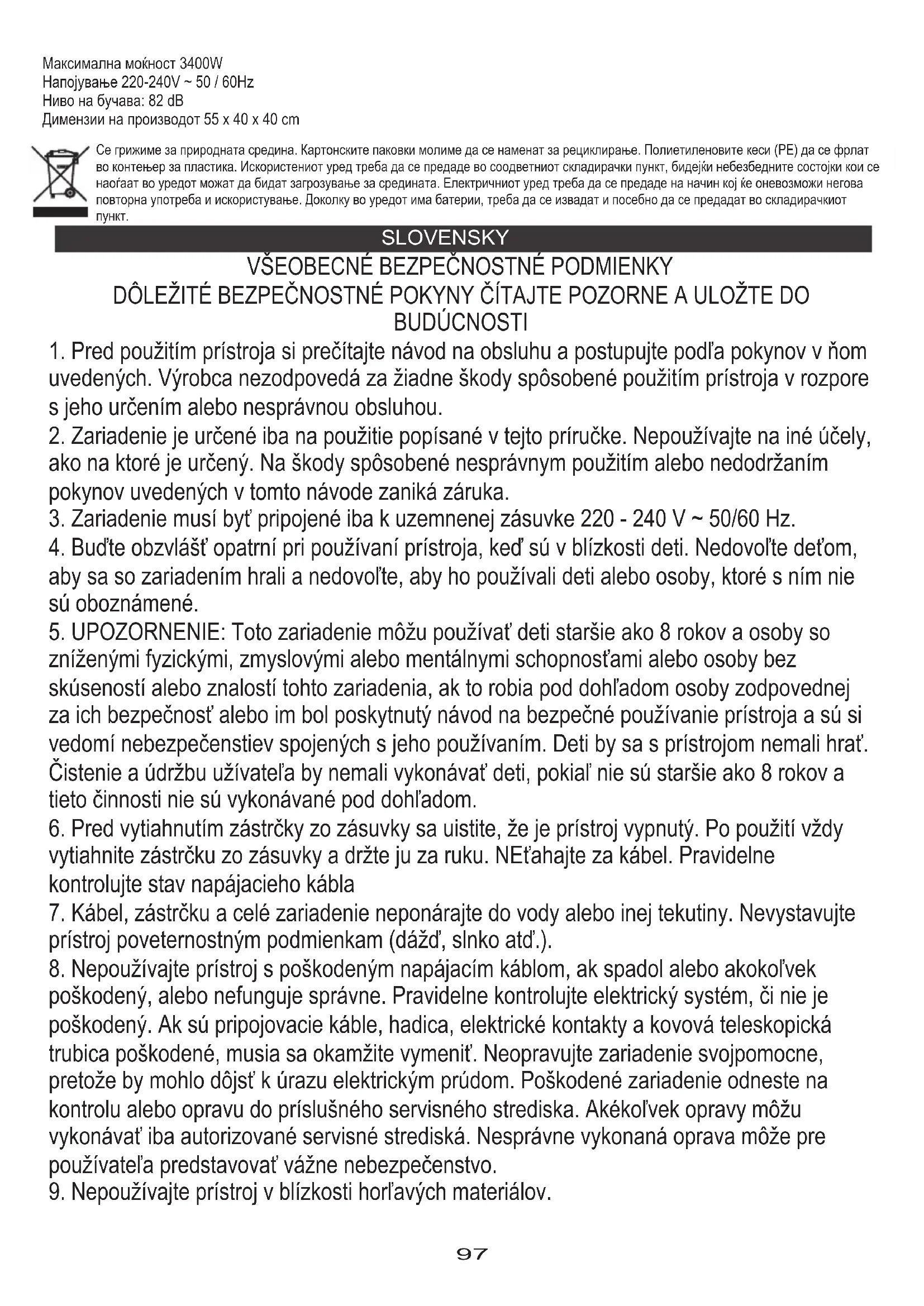 TEHNIČNA SPECIFIKACIJA: Prostornina rezervoarja 25 litrov Pretok zraka 36L / S (2,16m³ / h) Sesalna moč 20 kPa Nazivna moč 1400 W Vtičnica za električno orodje s sinhronizacijo: 2000W Največja moč 3400W Napajanje 220-240V ~ 50 / 60Hz Raven hrupa: 82 dB Dimenzije izdelka 55 x 40 x 40 cm Starostlivosť o životné prostredie. Kartónový obal odovzdajte do zberných surovín. Polyetylénové vrecká (PE) vyhoďte do kontajnera na plast. Opotrebený spotrebič odovzdajte na príslušný zberný dvor, nebezpečné látky spotrebiča môžu predstavovať riziko pre životné prostredie. Elektrospotrebič odstráňte tak, aby nedochádzalo j jeho ďalšiemu použitiu. Ak sa v spotrebiči nachádzajú batérie, vyberte ich a odovzdajte ich na zberné miesto osobitne. Spotrebič nevyhadzujte do kontajnera na komunálny odpad!66