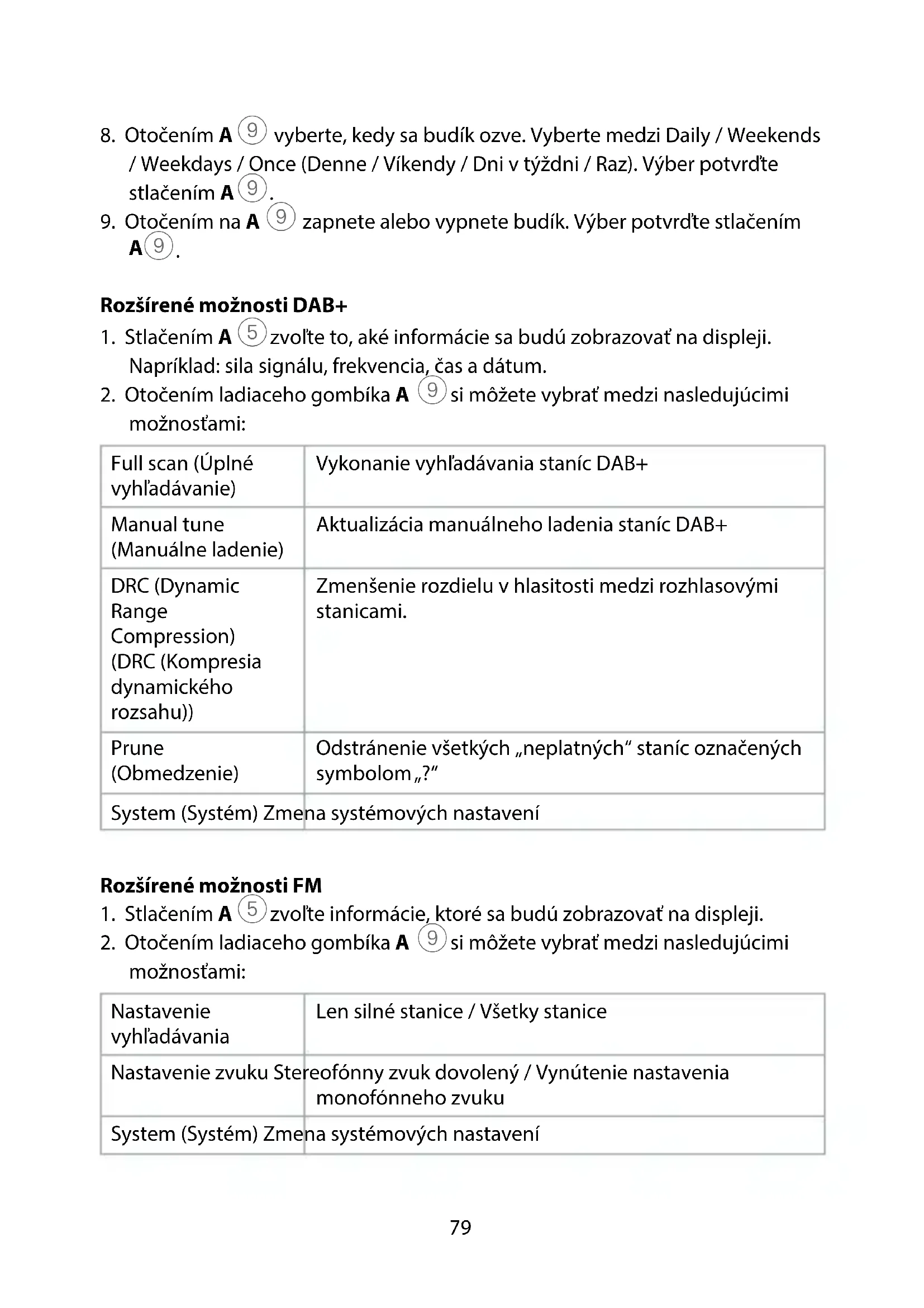 si môžete vybrať medzi nasledujúcimi možnosťami: Full scan (Úplné vyhľadávanie) Vykonanie vyhľadávania staníc DAB+ Manual tune (Manuálne ladenie) Aktualizácia manuálneho ladenia staníc DAB+ DRC (Dynamic Range Compression) (DRC (Kompresia dynamického rozsahu)) Zmenšenie rozdielu v hlasitosti medzi rozhlasovými stanicami. Prune (Obmedzenie) Odstránenie všetkých „neplatných“ staníc označených symbolom „?“ System (Systém) Zmena systémových nastavení Rozšírené možnosti FM