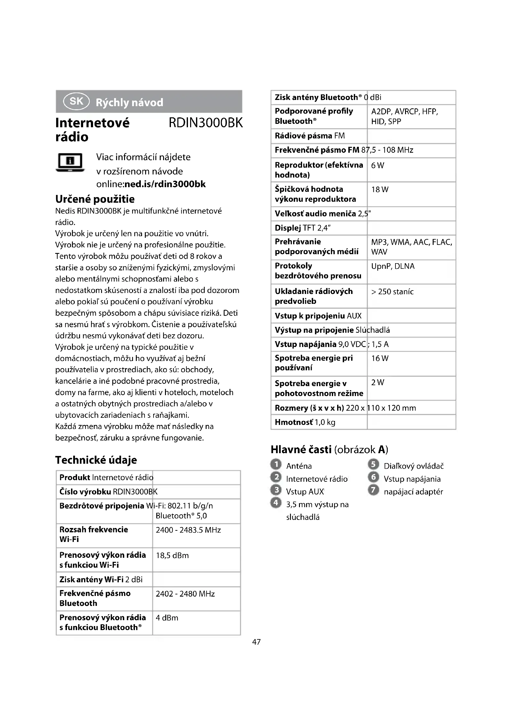 Rýchly návod Internetové rádio RDIN3000BK Viac informácií nájdete v rozšírenom návode online:ned.is/rdin3000bk Určené použitie Nedis RDIN3000BK je multifunkčné internetové rádio. Výrobok je určený len na použitie vo vnútri. Výrobok nie je určený na profesionálne použitie. Tento výrobok môžu používať deti od 8 rokov a staršie a osoby so zníženými fyzickými, zmyslovými alebo mentálnymi schopnosťami alebo s nedostatkom skúseností a znalostí iba pod dozorom alebo pokiaľ sú poučení o používaní výrobku bezpečným spôsobom a chápu súvisiace riziká. Deti sa nesmú hrať s výrobkom. Čistenie a používateľskú údržbu nesmú vykonávať deti bez dozoru. Výrobok je určený na typické použitie v domácnostiach, môžu ho využívať aj bežní používatelia v prostrediach, ako sú: obchody, kancelárie a iné podobné pracovné prostredia, domy na farme, ako aj klienti v hoteloch, moteloch a ostatných obytných prostrediach a/alebo v ubytovacích zariadeniach s raňajkami. Každá zmena výrobku môže mať následky na bezpečnosť, záruku a správne fungovanie. Technické údaje Produkt Internetové rádio Číslo výrobku RDIN3000BK Bezdrôtové pripojenia Wi-Fi: 802.11 b/g/n Bluetooth® 5,0 Rozsah frekvencie Wi-Fi 2400 - 2483.5 MHz Prenosový výkon rádia s funkciou Wi-Fi 18,5 dBm Zisk antény Wi-Fi 2 dBi Frekvenčné pásmo Bluetooth 2402 - 2480 MHz Prenosový výkon rádia s funkciou Bluetooth® 4 dBm48
