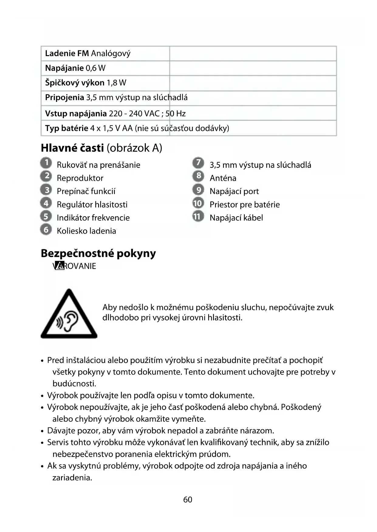 RDFM1330GY Viac informácií nájdete v rozšírenom návode online:ned.is/rdfm1330gy Určené použitie RDFM1330GY je prenosné rádio AM/FM, ktoré je možné používať za chodu s batériami alebo sa môže pripojiť k napájacej elektrickej zásuvke. Výrobok nie je určený na profesionálne použitie. Každá zmena výrobku môže mať následky na bezpečnosť, záruku a správne fungovanie. Technické údaje Produkt Rozhlasový prijímač s pásmom FM Číslo výrobku RDFM1330GY Rozmery (h x š x v) 50 x 180 x 170 mm Rádiové pásma FM / AM Frekvenčné pásmo FM 87,5 - 108,0 MHz Frekvenčné pásmo AM 530 - 1600 kHz60 Ladenie FM Analógový Napájanie 0,6 W Špičkový výkon 1,8 W Pripojenia 3,5 mm výstup na slúchadlá Vstup napájania 220 - 240 VAC ; 50 Hz Typ batérie 4 x 1,5 V AA (nie sú súčasťou dodávky) Hlavné časti (obrázok A)