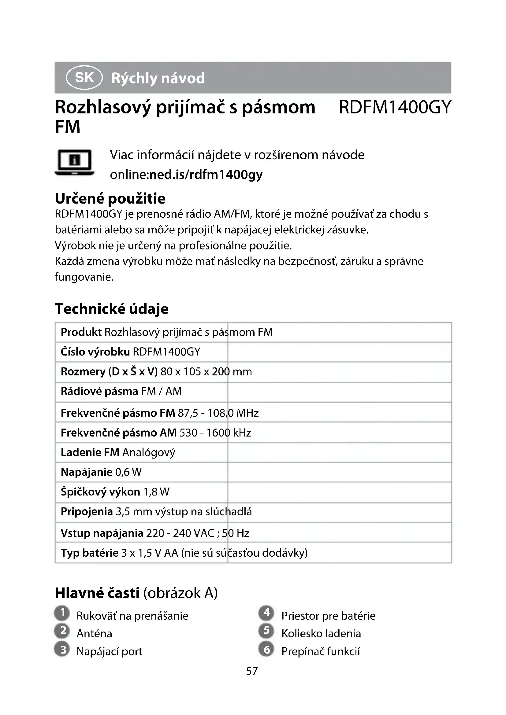 RDFM1400GY Viac informácií nájdete v rozšírenom návode online:ned.is/rdfm1400gy Určené použitie RDFM1400GY je prenosné rádio AM/FM, ktoré je možné používať za chodu s batériami alebo sa môže pripojiť k napájacej elektrickej zásuvke. Výrobok nie je určený na profesionálne použitie. Každá zmena výrobku môže mať následky na bezpečnosť, záruku a správne fungovanie. Technické údaje Produkt Rozhlasový prijímač s pásmom FM Číslo výrobku RDFM1400GY Rozmery (D x Š x V) 80 x 105 x 200 mm Rádiové pásma FM / AM Frekvenčné pásmo FM 87,5 - 108,0 MHz Frekvenčné pásmo AM 530 - 1600 kHz Ladenie FM Analógový Napájanie 0,6 W Špičkový výkon 1,8 W Pripojenia 3,5 mm výstup na slúchadlá Vstup napájania 220 - 240 VAC ; 50 Hz Typ batérie 3 x 1,5 V AA (nie sú súčasťou dodávky) Hlavné časti (obrázok A)